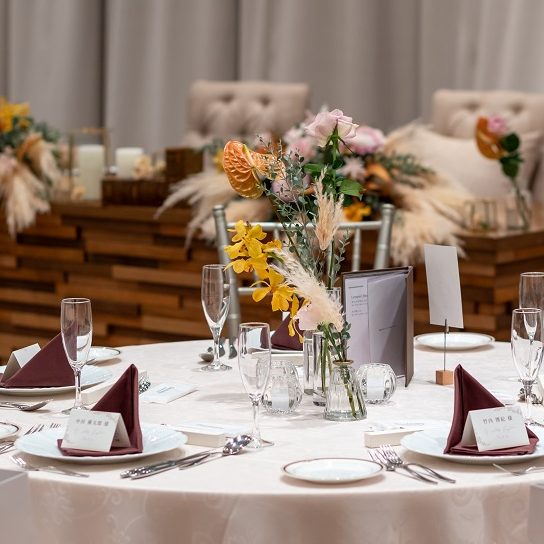 会場のお花はブラウンやベージュ、オレンジ等の秋カラーを多く取り入れました。