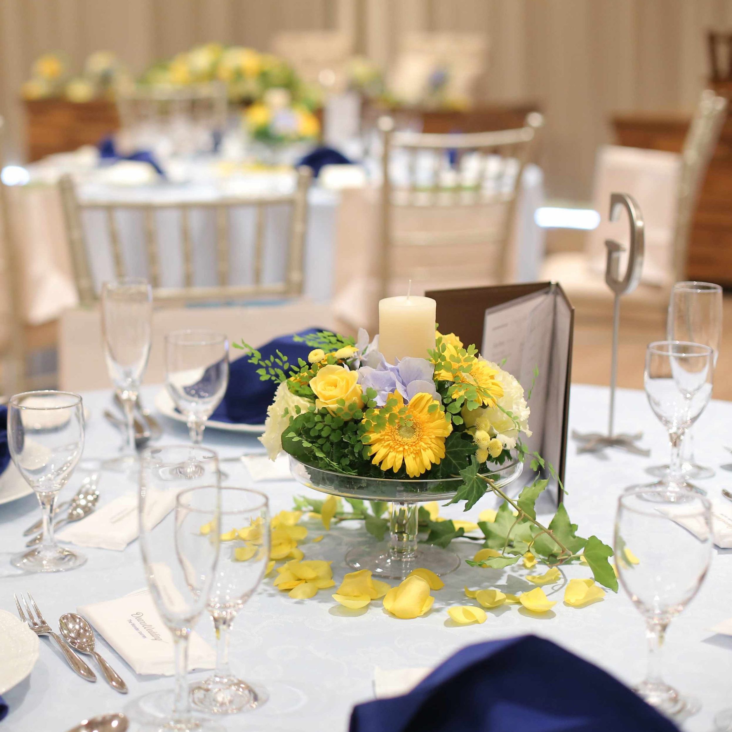 披露宴会場のメインテーブルの後ろにはガーデンが広がっており、前面がガラス張りなのでとても明るいです。中の演出設備も充実しており、プロジェクションマッピングに感激しました。
