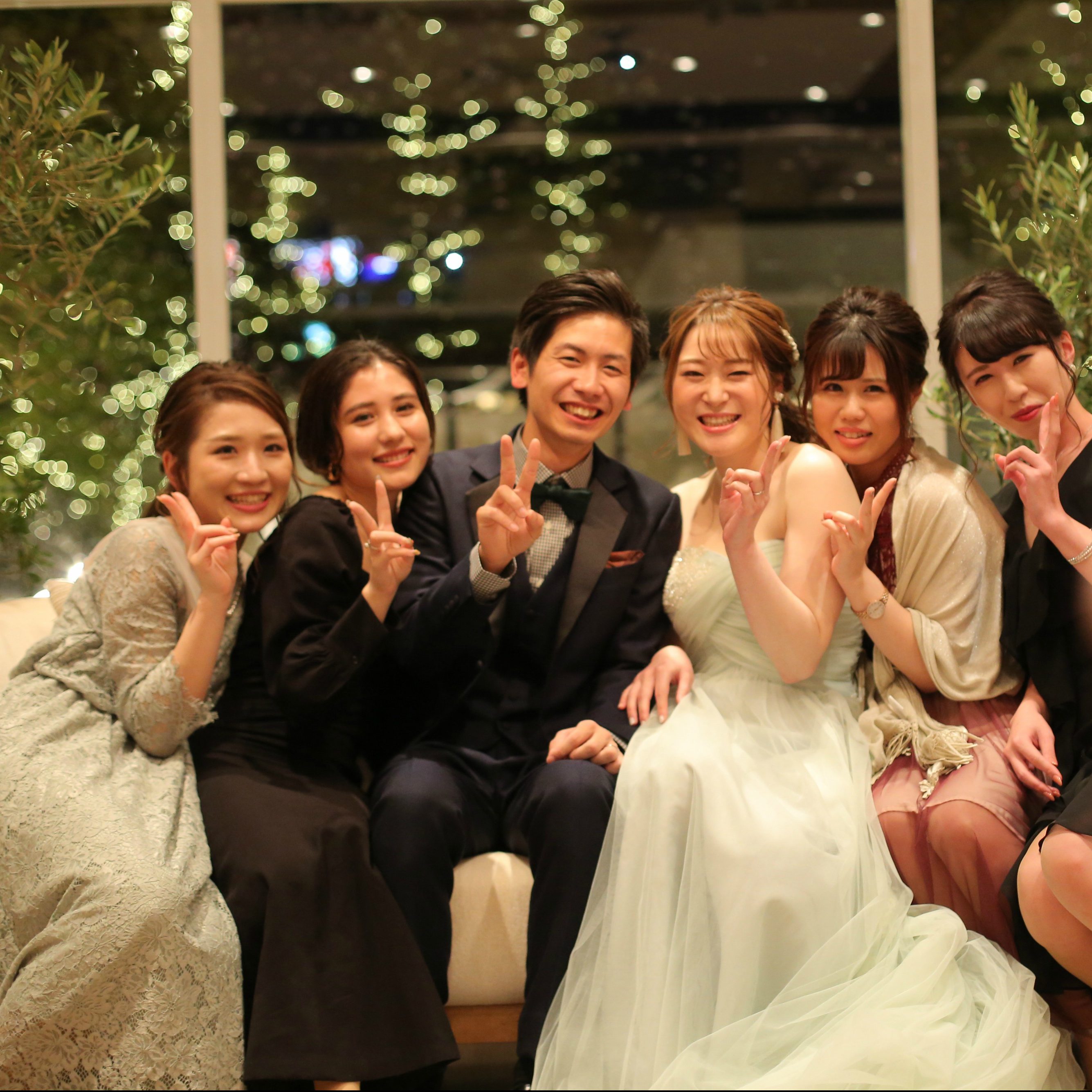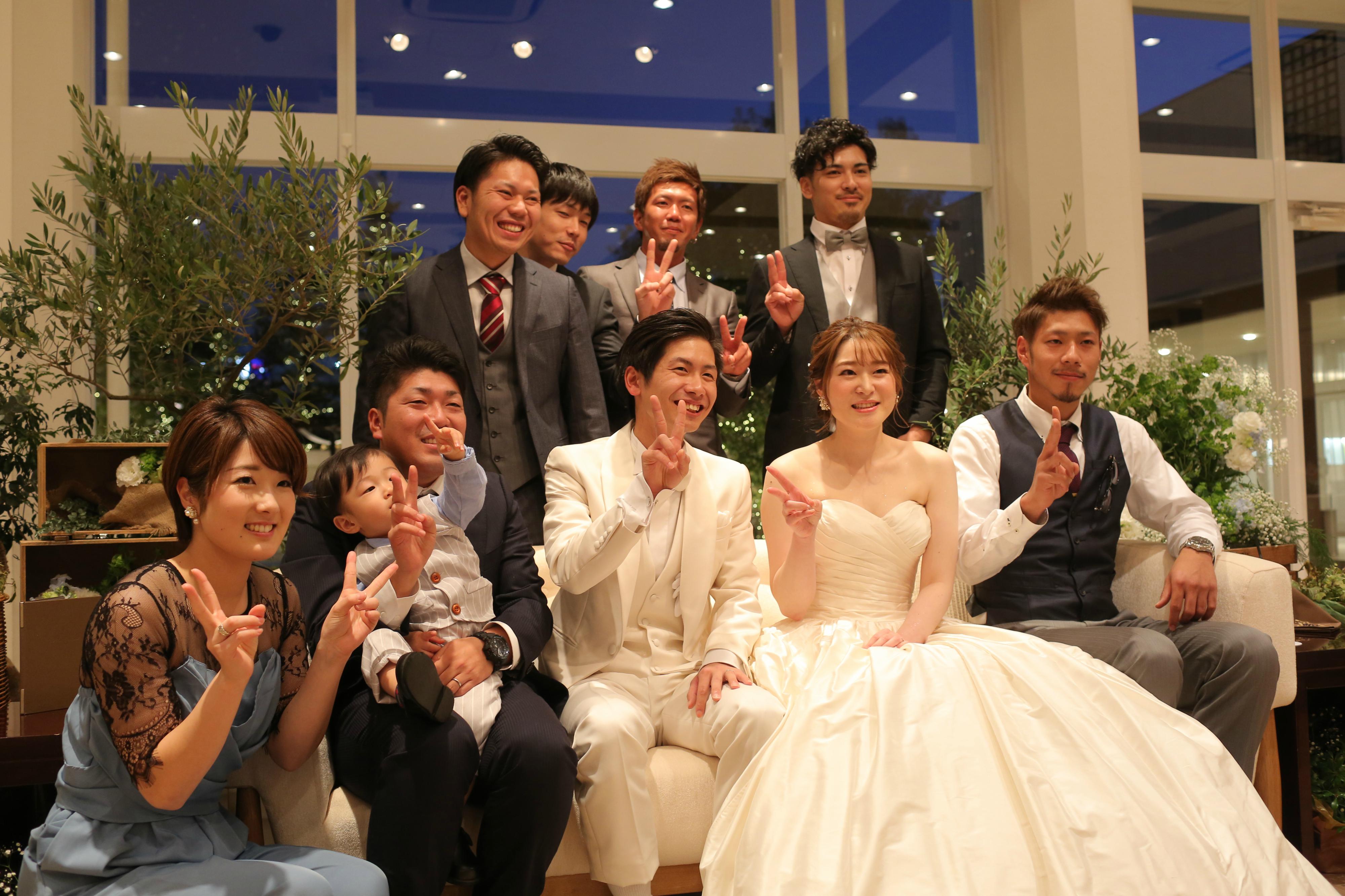 新郎新婦友人ゲスト全員で写真を撮ったこと。