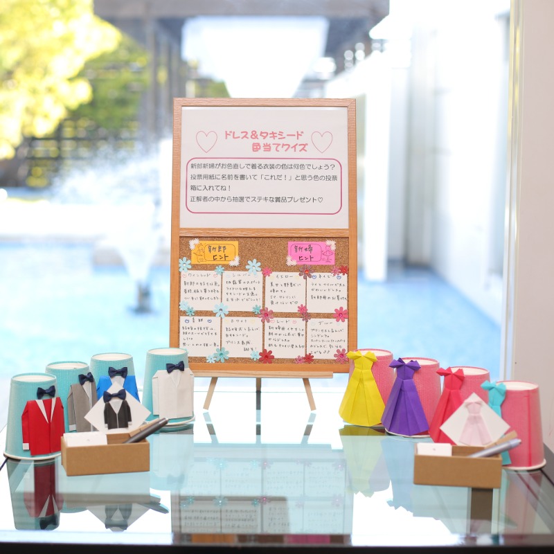 そして、ウェルカムボードやドレスの色当てなど全て手作りで準備しました。