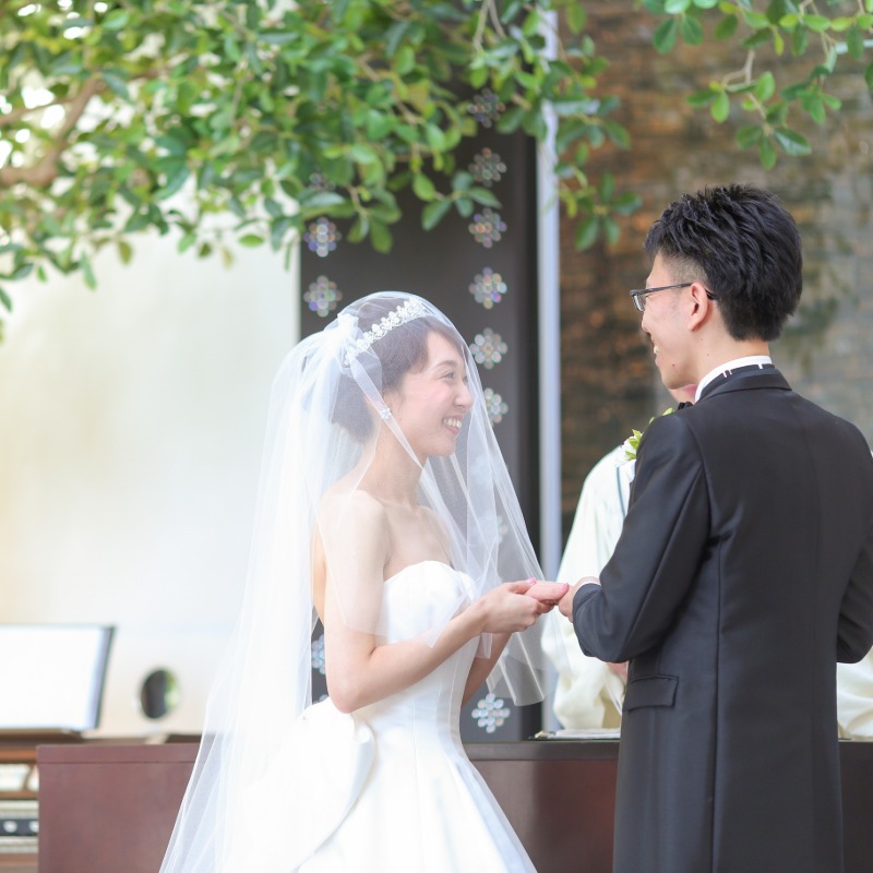 すこし緊張した彼の顔を見ながら太陽の光が降り注ぐチャペルで誓い。