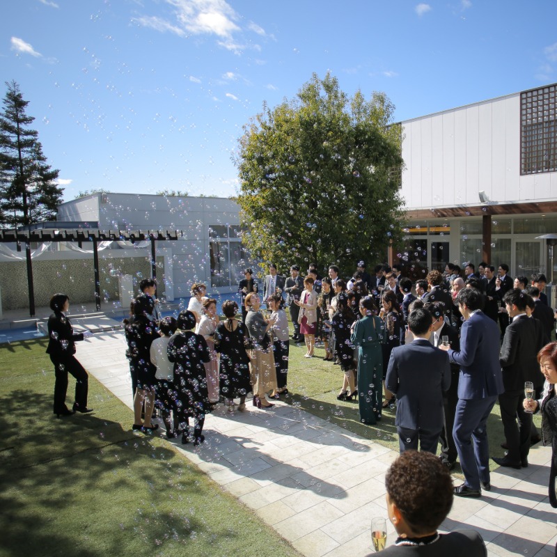 1つ目は最初外からの登場で乾杯はゲストのみなさんに外に出てきていただき、ガーデンで乾杯!