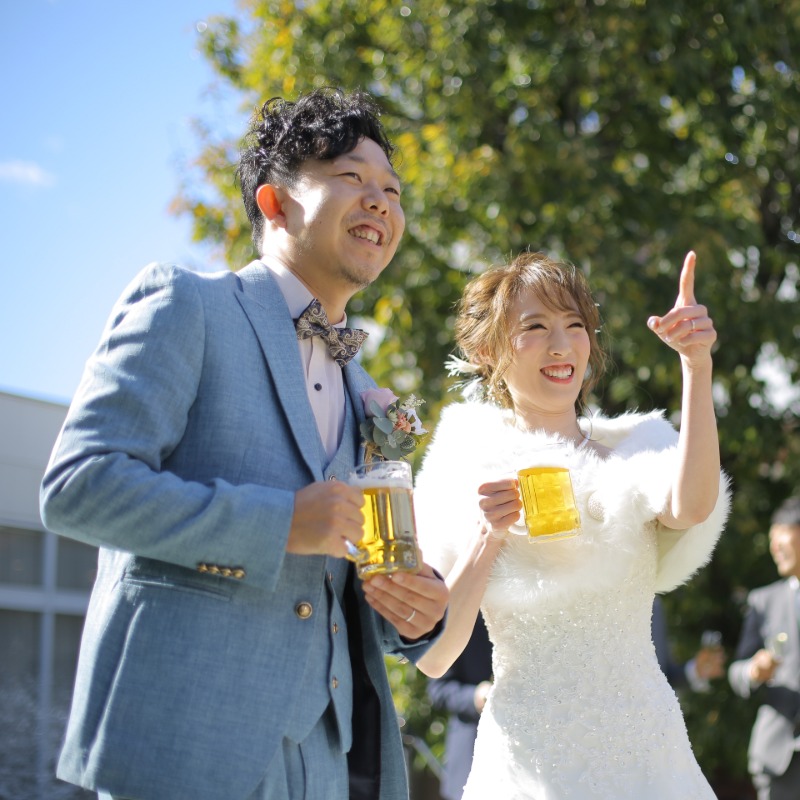 3つ目はなかなか他の人はやらないような事をしたいと思い、新郎新婦で大好きなビールで腕を組みあって友情乾杯という変わった事もやりました。
