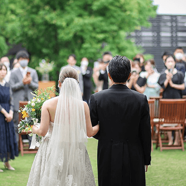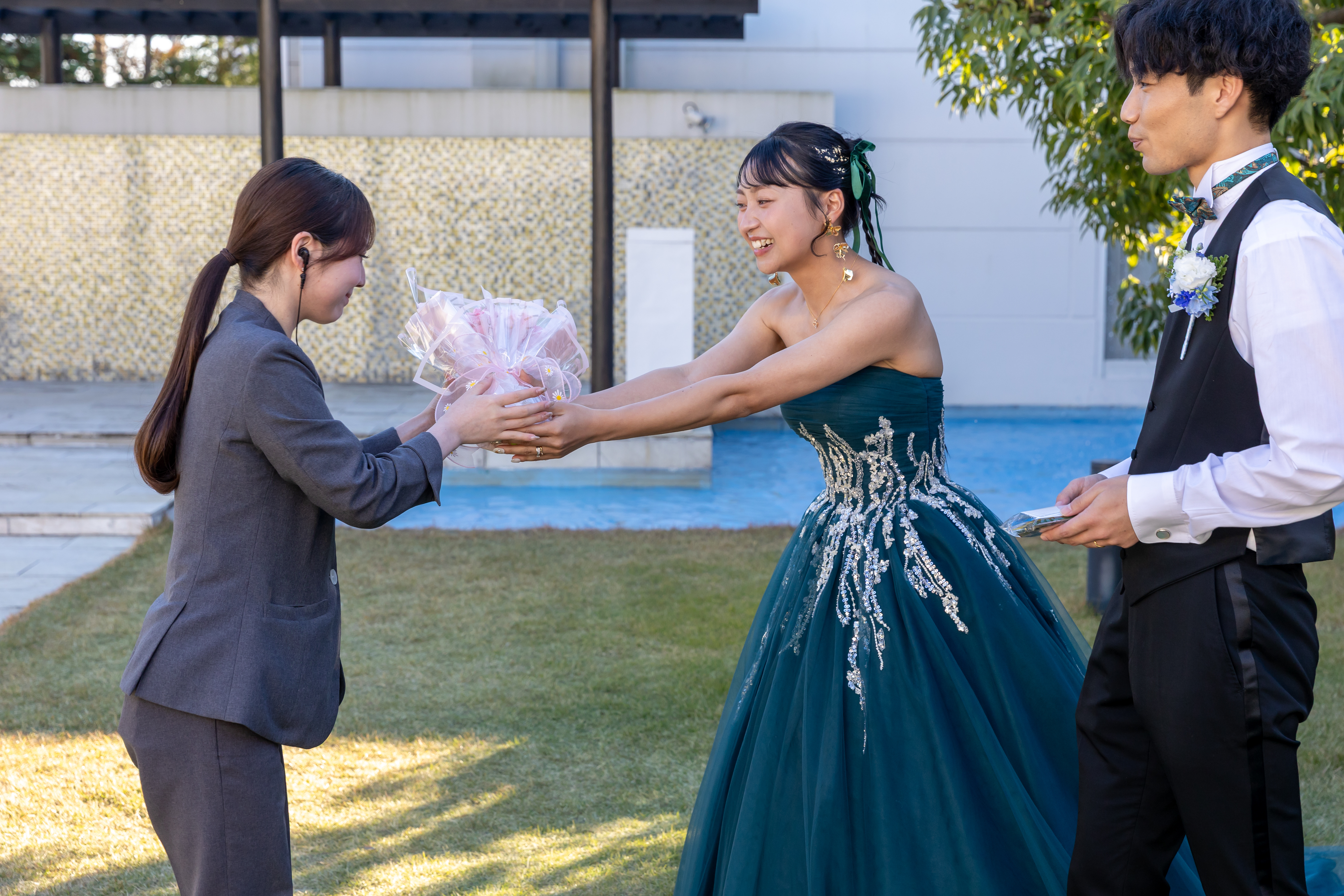 披露宴では、おふたりが当初から強く希望されていた「アフターセレモニー」と「ガーデン乾杯」の両方を実現することができました。青空の下、おふたりの願いが叶ったその瞬間、そばで見守っていた私は感無量の想いで胸がいっぱいに。ゲストの皆様に囲まれて、溢れるほどの笑顔でお写真を撮られたり、楽しそうに乾杯される姿を見て、私まで心からの幸せをいただきました。
