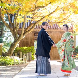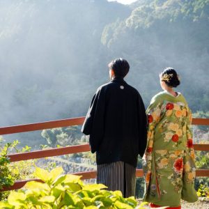 黒色の紋付き袴と鮮やかな緑の色打掛との