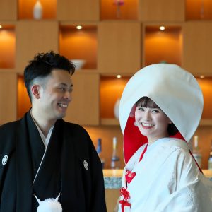 紅色が入った白無垢、さらには綿帽子のヘアスタイルで