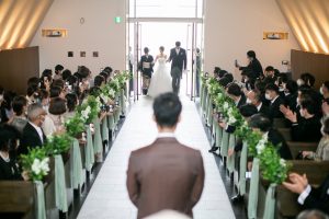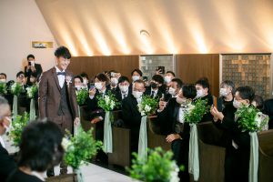 さっきまでの緊張が少し和らぎ、証人となるゲストのみなさまに「おめでとう」「頑張れよ!」と見守られながら新郎様が一歩一歩ずつ進みいただき、これから人生をともにする新婦様のご入場をお待ちいただきます