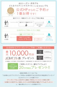 事前予約して頂き、カップルでの1件目来館、且つ、ブライダルフェア当日にお申し出いただいたお客様にプレゼントさせていただく特典のご紹介です。