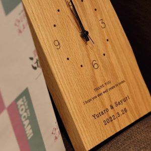 1枚の無垢材で作られる3連時計は、新郎新婦様が架け橋となり、