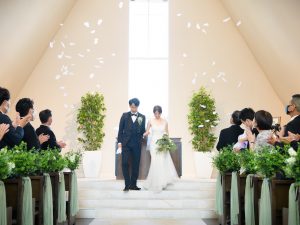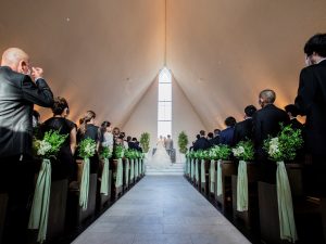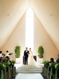 アイボリーの空間にウッディなチェアが並ぶチャペル