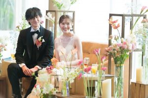 ぴょんぴょんとした装花を合わせお洒落な抜け感を演出♩