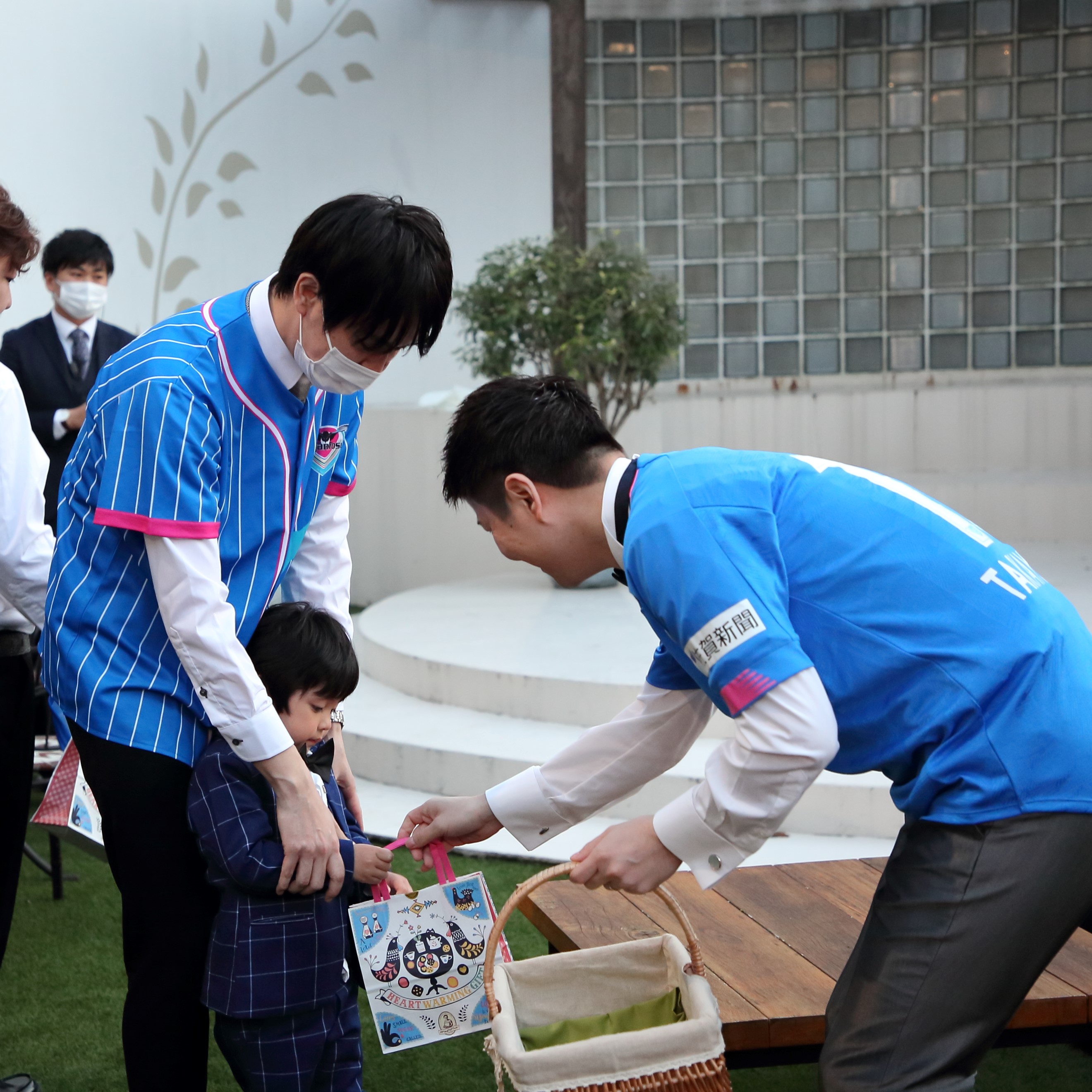 サガン鳥栖のカラーをテーブルコーディネートで選んだり、プランナーさんのアイデアでサッカーボールチョコが当たりのお菓子まきや、リフティング大会を提案して下さり式の中のゲームとして使わせていただきました。