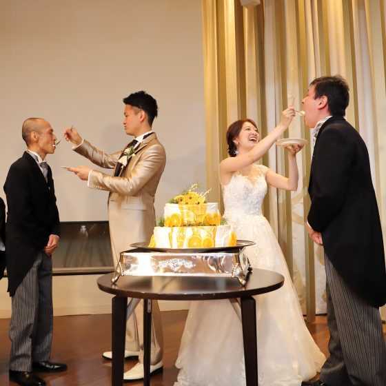 そして特にお世話になった方々へ、日頃の感謝を込めてウエディングケーキのサンクスバイトと、再入場時にプレゼントを渡すサプライズを行いました。