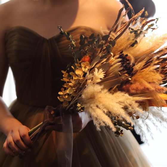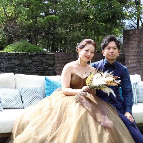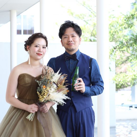 ウェディングドレスは、ドライフラワーのヘッドドレスを使いたかったため、テーマに合ったナチュラルな雰囲気のものを提案していただきました。カラードレスは、カラフルなものよりもくすみカラーが希望だったので、落ち着いた色合いのものを探していただきました。初秋らしいオリーブ色のドレスに一目惚れしました。延期した期間に妊娠・出産を控えていたため、ドレスのサイズが何度も変更となりましたが、快く対応していただきました。