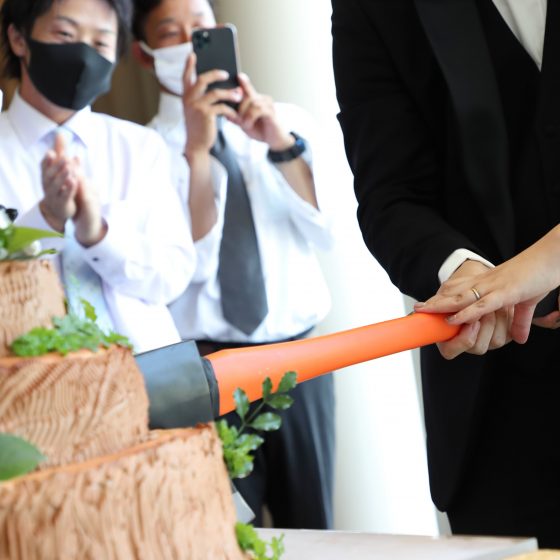 ウェディングケーキは、私たちのテーマである木をイメージして、切り株のケーキを作っていただきました。おもちゃの斧と本物の斧を用意して、童話の金の斧銀の斧のような流れで友人に本物の斧を持ってきてもらい、盛り上がる中、斧でケーキ入刀を行いました。
