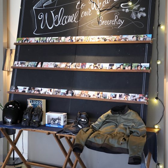 夫婦ふたりともインテリアが好きなので、式場のディスプレイやペーパーアイテムは特にこだわりたいポイントでした。フォトスペースには同僚に作ってもらった木製ラックを取り付け、ふたりの思い出の写真をたくさん並べました。ふたりとも植物が好きなので、グリーンをメインとしたテーブルコーディネートと、森のように木と葉っぱでいっぱいのメインテーブル、ドライフラワーメインのウェディングブーケをお願いしました。イメージを持ち寄り、私たちの好きなイメージを細かく伝えて、当日希望したもの以上の仕上がりにしていただきました。また、夫が大切にしているバイクをウェルカムスペースに展示することも実現できました。