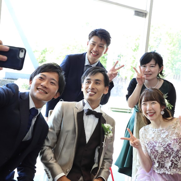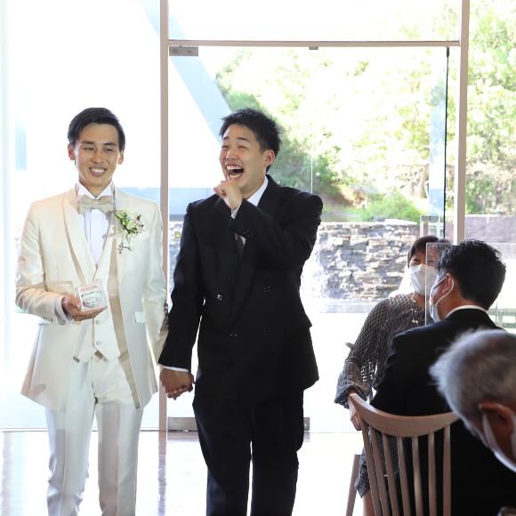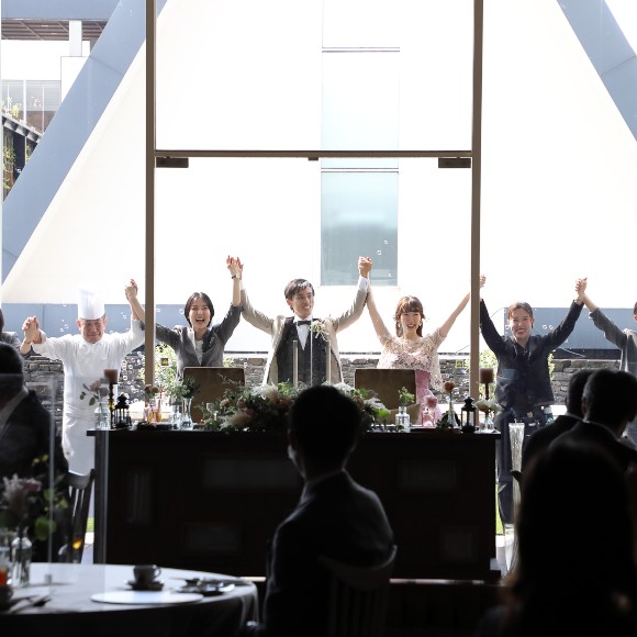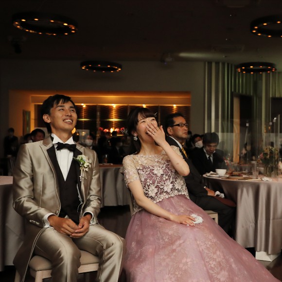 コロナ禍で、久しぶりの外食やお酒という方もいらっしゃるかと思い、とにかくお料理やお酒を楽しんでもらいたい!と思いました。演出に関しては、来てくださった方がわくわくするような、、、感動・興奮するような楽しい演出になるよう、各専門のスタッフさんと念入りに打ち合わせをしました。どのスタッフさんも知恵を絞りながら親身になって協力してくださりました。実際にレーザーやライト・音楽の雰囲気で、来てくださった皆様に楽しんで頂けるような演出ができました。新郎新婦からの出し物では、こちらも来てくださった皆様に楽しんでもらいたい!と思い、歌を歌いながら再入場させて頂きました。とても緊張しましたが、来てくださった皆様からは好評でしたので、挑戦して良かったな!と思っています。