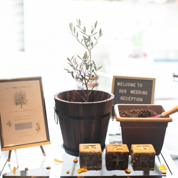 挙式では人前式を選び、式の中でオリーブの植樹式をしました。受付後に、植木鉢の中に土をひとすくい入れて頂き、私たちが式中に水を注ぐというものです。ペーパーアイテムにもオリーブを選び、統一感を出しました。メニュー表のみ手作りしました。ブリーズレイさんのレーザー演出では、私たちの好きなものを詰め込んで作ってくださいました。初めて見た時の感動は忘れられません!また、想像していた通りに音楽をかけていただき、本当に理想通りに式を挙げることができました!