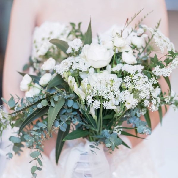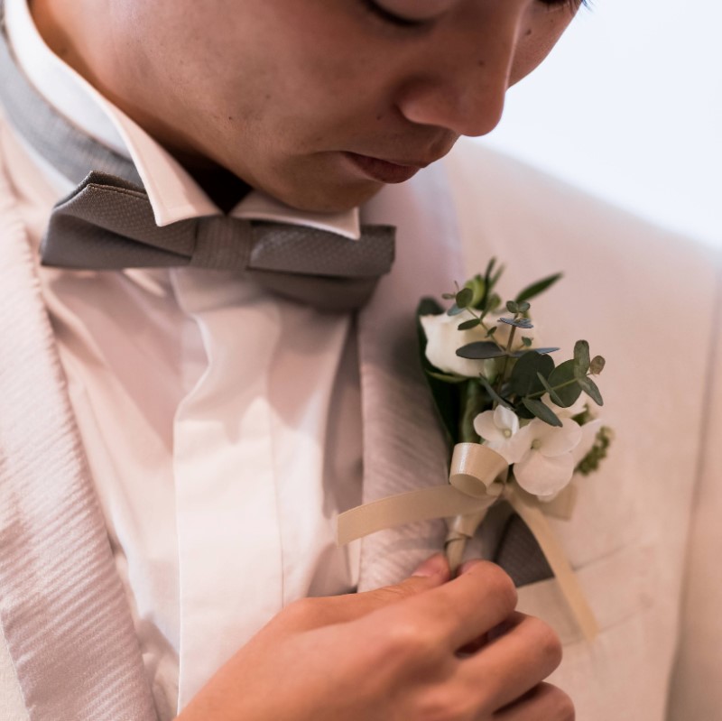 また、新郎新婦の衣装に合わせて会場内の飾りつけやブーケの色も統一感を出しました。