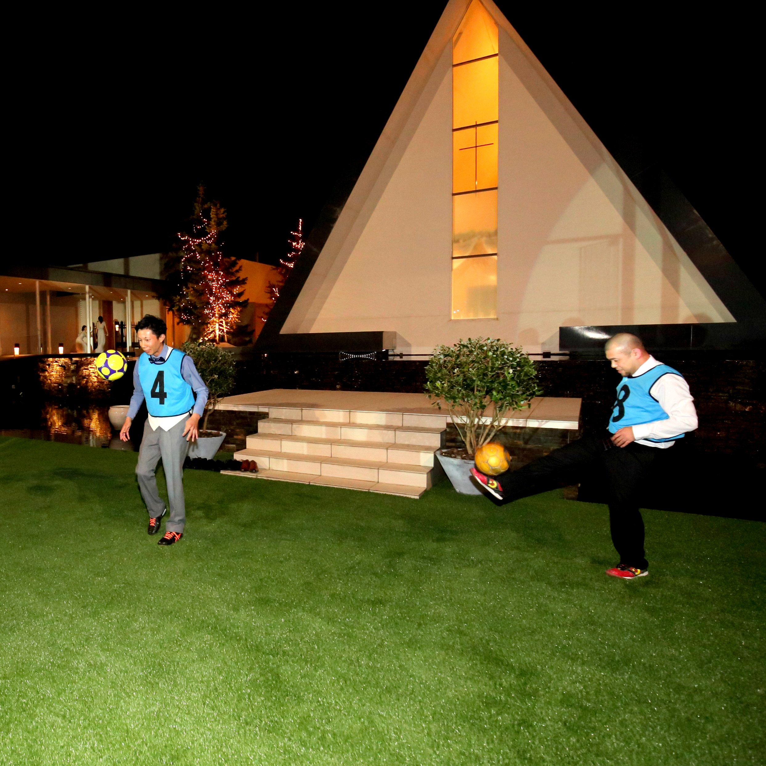 2部の友人とのパーティではとにかくみんなと楽しみたい!楽しんでもらいたい!と思っていたので、参加型の催しを計画。テーブルラウンドでみんなに瓶に果実を入れてもらい果実酒を作りました。そして旦那さん・息子がやっているサッカーを使った演出をやりたくて、ガーデンでリフティングゲームを。旦那さんの友人4人で競ってもらい、他のゲストは優勝者を予想し投票してもらうという形で参加してもらいました。貸切かつ広いガーデンがあるブリーズレイさんだからこそ出来た事です。