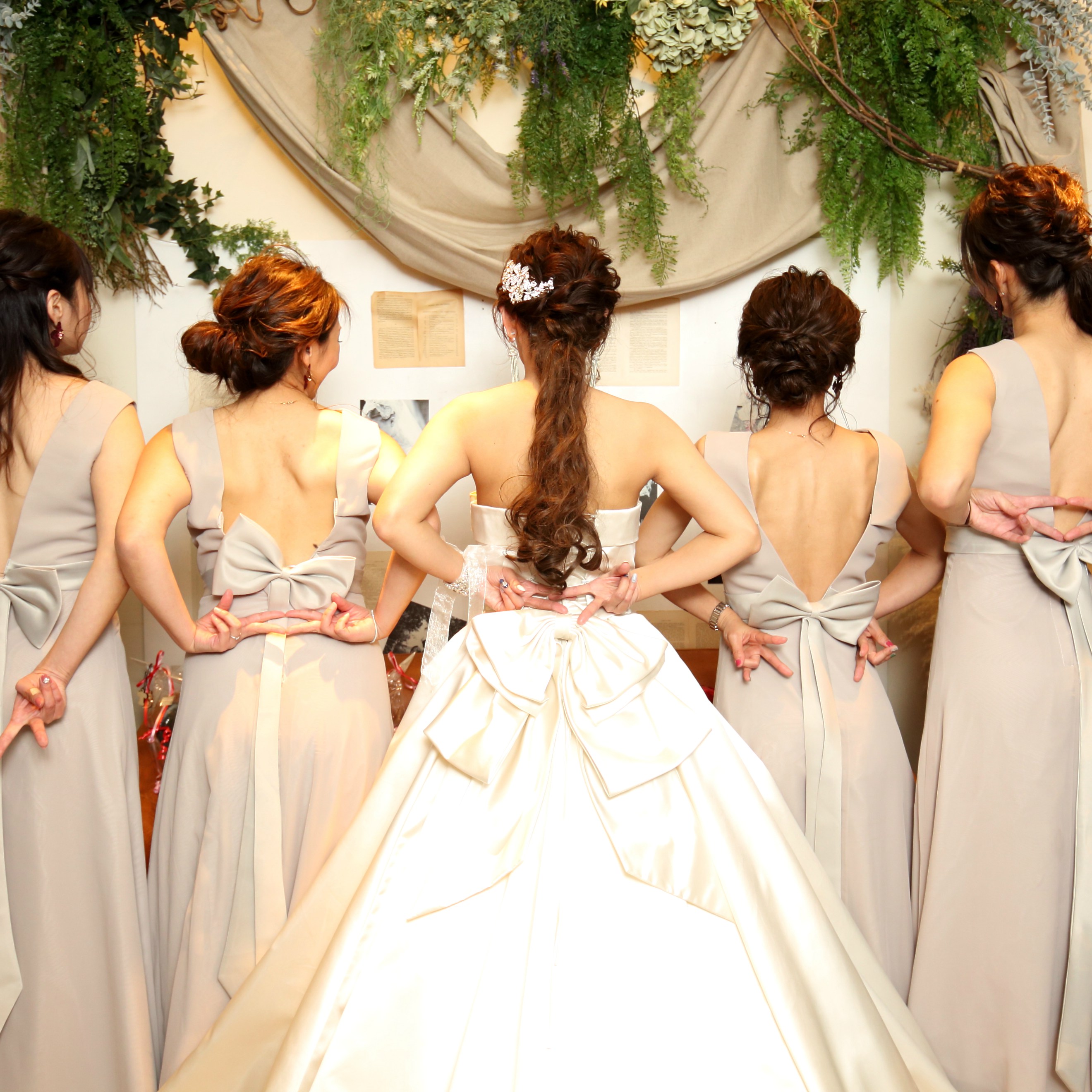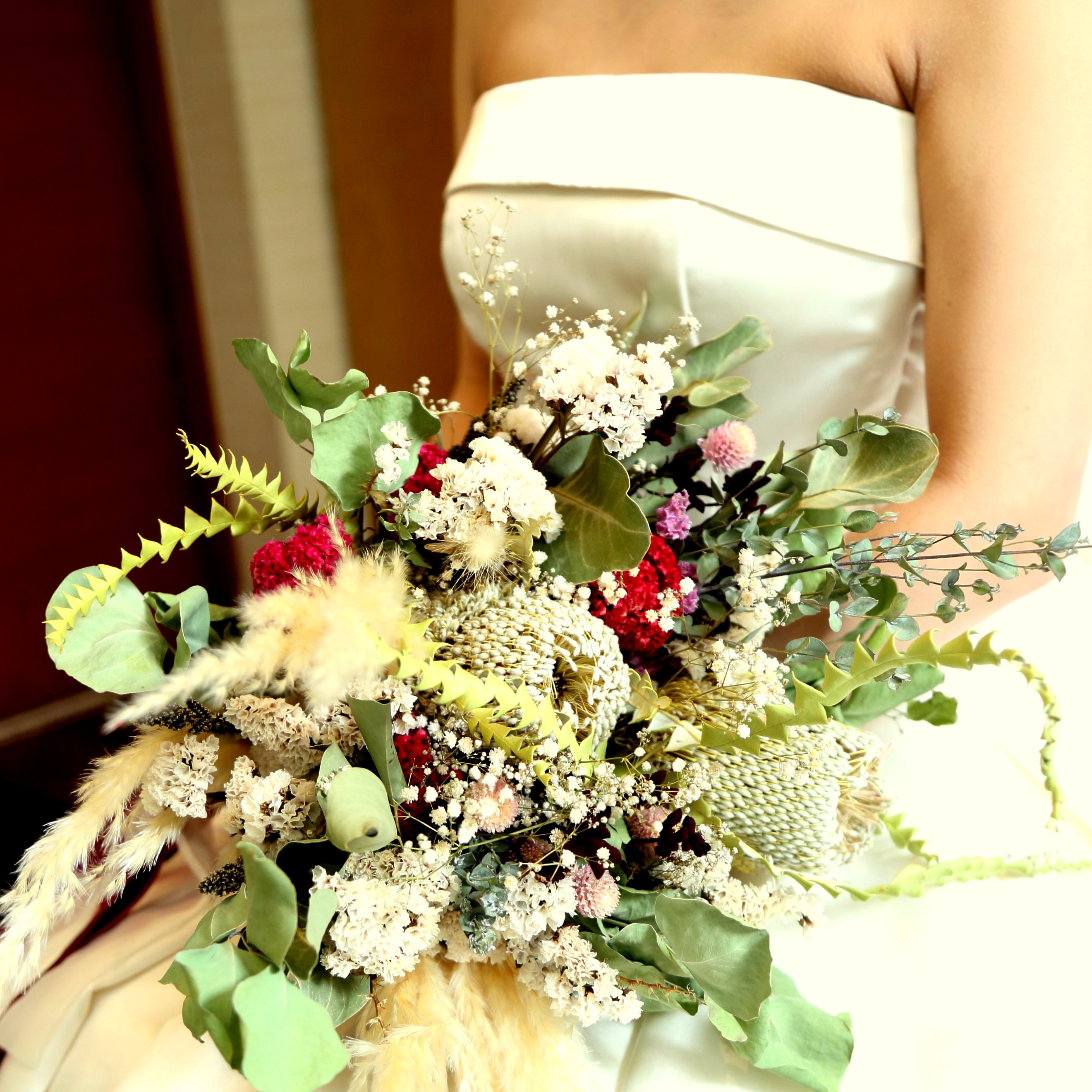 挙式は、家族にも友人にも参列して頂きたかったので、2部あるパーティの間に挙式をさせてもらいました。友人4人がお揃いの衣装で、ブライズメイドとして挙式のお手伝いをしてくれました。ブーケやグローブを預かってくれたり、誓約書や指輪を渡してもらったり。1番の友人に側で見守ってもらえて嬉しかったです。ガーデンセレモニーではサプライズで妹へブーケのプレゼント。ブーケもドライフラワーにしたいとゆうこだわりがあったので、葉っぱの種類からリボンの色まで要望を伝えました。ナチュラルで季節にピッタリのイメージ通りのブーケが出来上がり大満足でした。