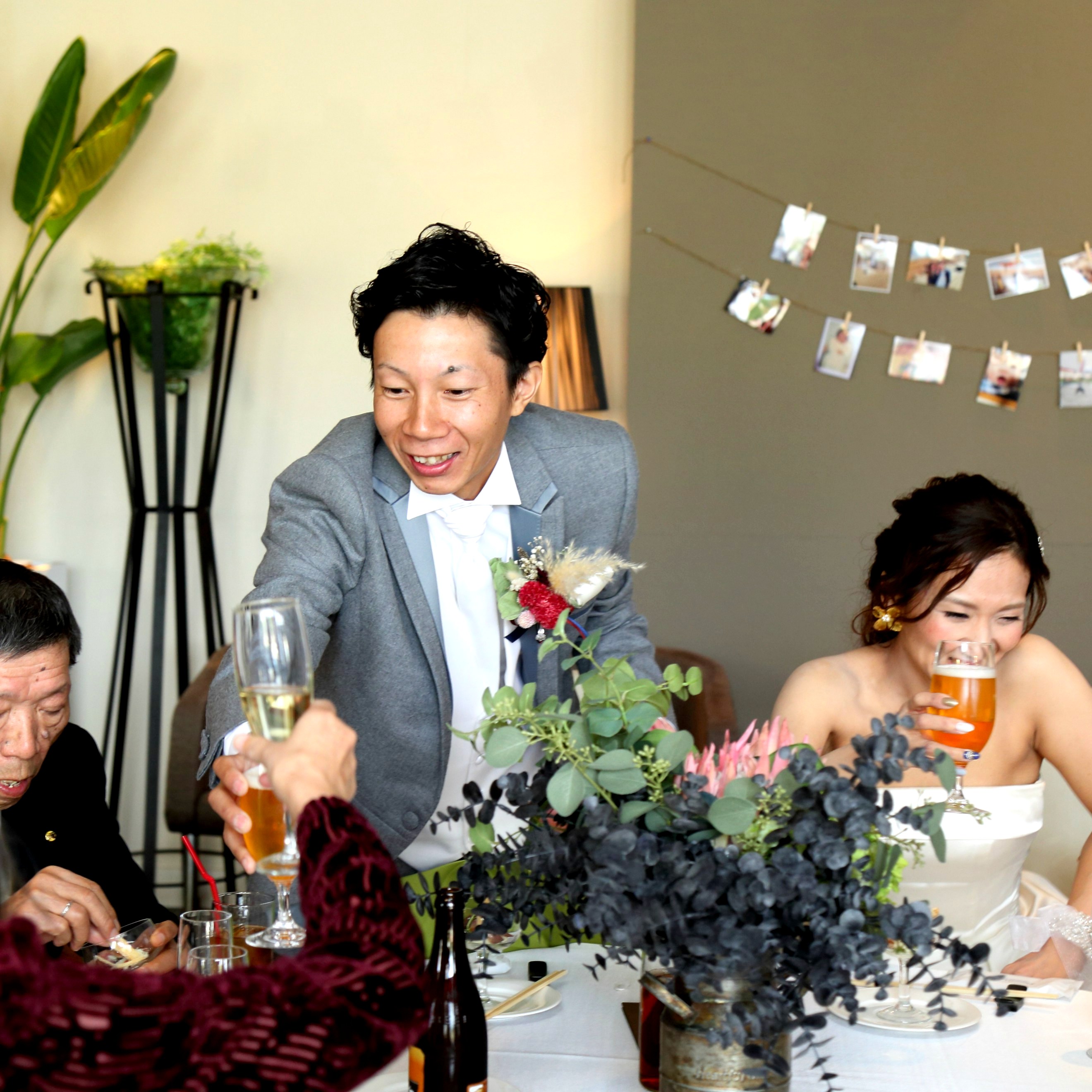 2部制というのは珍しいスタイルなので、どんな反応があるか少し不安でしたが、まず1部での家族のみのお食事会では、家族や親族がふたりと沢山話せて近くに感じれて良かったと喜んでくれました。私達もアットホームな雰囲気の中でリラックスして過ごすことが出来ましたし、1人1人に感謝の気持ちを伝える事が出来て本当に良かったと思います。友人からもめっちゃいい結婚式やった!楽しかった!といってもらえました。お互いの友人達は余興にブライズメイド、ブーケを作ってくれたりと、色々準備をしてお祝いしてくれました。みんなからの愛情をたくさん感じれて本当に幸せな1日でした。