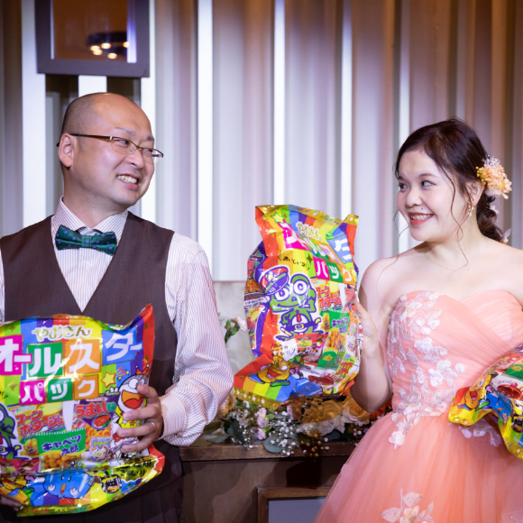 私たちの式を考える中での一番のポイントとなったのは、参加して頂くゲストの皆様に喜んでほしい、この式に参加して良かったと思って頂きたいというものでした。事前準備では自分たちで手作りできるものはなるべく手作りで行い、少しでも私たちの感謝の気持ちが伝わるように心がけました。ムービーやウェルカムスペース、席札、プチギフトなどゲストの皆様の分を用意することは大変でしたが、相手の方とのエピソードを思い起こしながら作り、懐かしい気持ちになることができました。そのように楽しんで作業することができ、当日だけでなく、事前準備も含めて、とても幸せな時間を過ごすことができ、手作りをして良かったと心から思います。