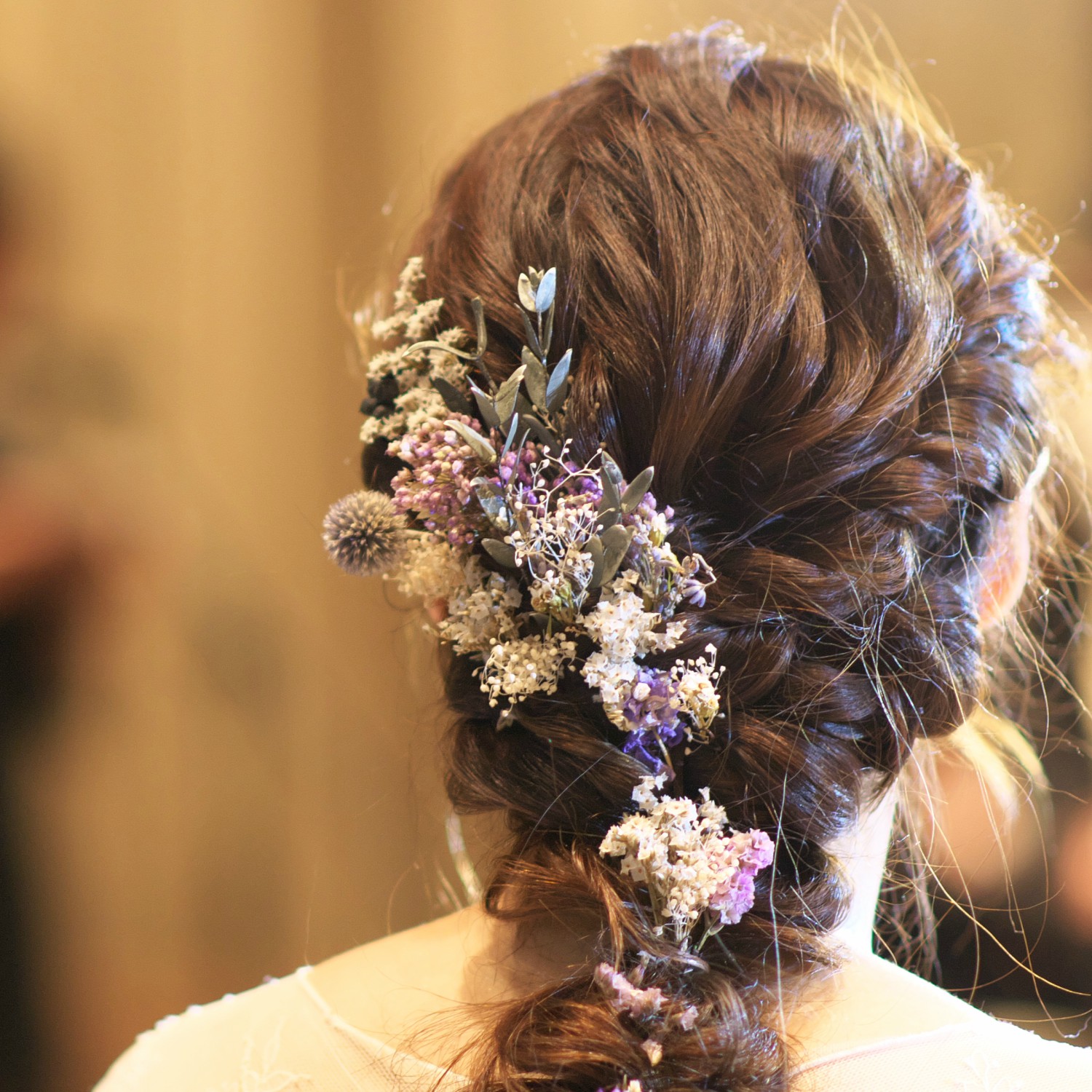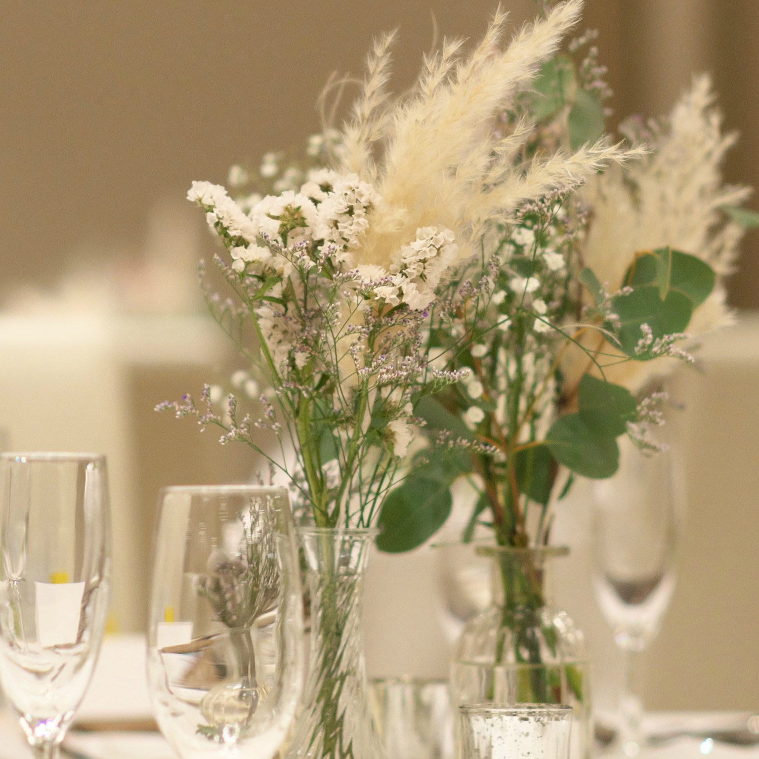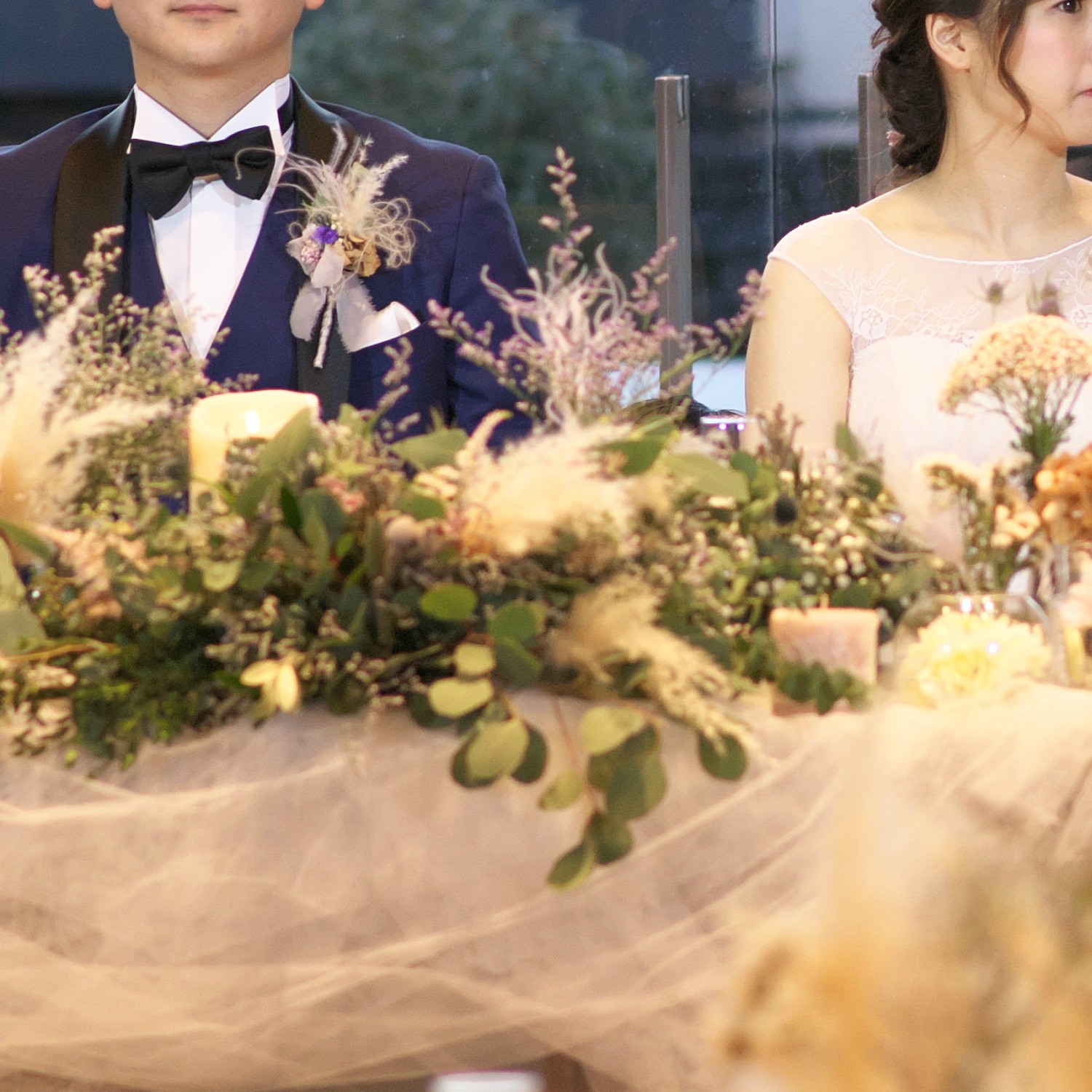 最初は緑いっぱいの高砂でと考えてましたが、やはりお花がほしい、ドライフラワーがいいな。と思い、再度打ち合わせしていただきました。打ち合わせする中でドライフラワーばっかりになると、少しの風で花びらが舞ってお料理の中に入ってしまうかも。とアドバイスを頂き、生花とドライフラワーを半分にしてもらい、私たちの高砂はドライフラワーをより多めに、緑とピンクでまとめて頂きました。当日見たときは、お花担当の方のセンスに驚き、想像以上でとっても可愛く仕上げてもらいました。