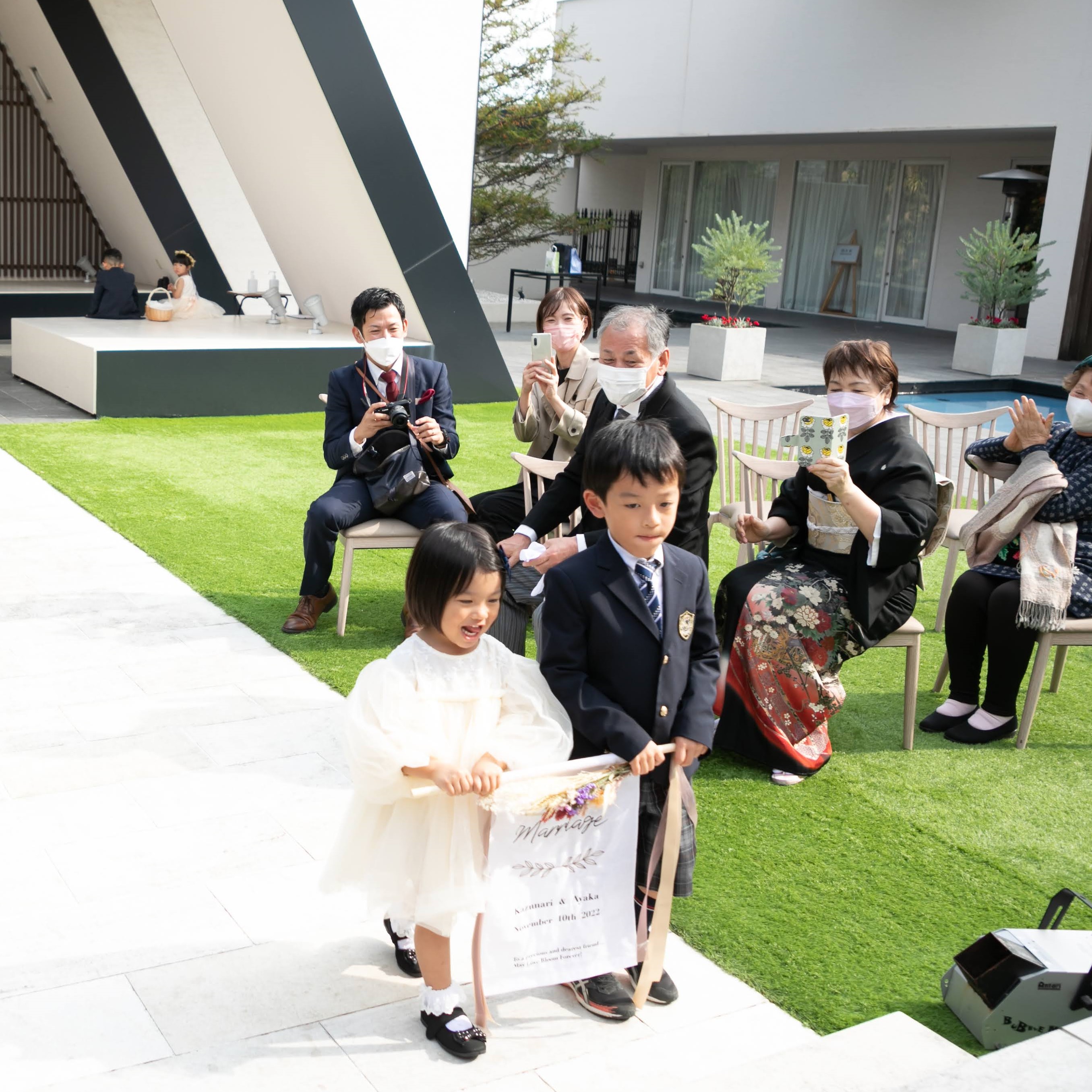 挙式は生演奏の中、私たちらしい結婚の誓い、指輪の交換、誓いのハグを行いました。またリングボーイ・ガール、フラッグボーイ・ガールという大役を務めてくれたお互いの甥っ子姪っ子にプレゼントなどあたたかい時間を過ごしました。