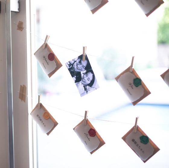 ウェルカムスペースの窓に手紙を吊るし、挙式前に一斉に読んでもらいました。1人1人との思い出を振り返りながら心を込めて書く時間は私にとってもすごく幸せなものでした。私が登場する前に号泣していた友人や、普段手紙を貰うことがないから嬉しかったと親族からの感想もあり、最もゲストへの感謝を伝えられた演出でした。