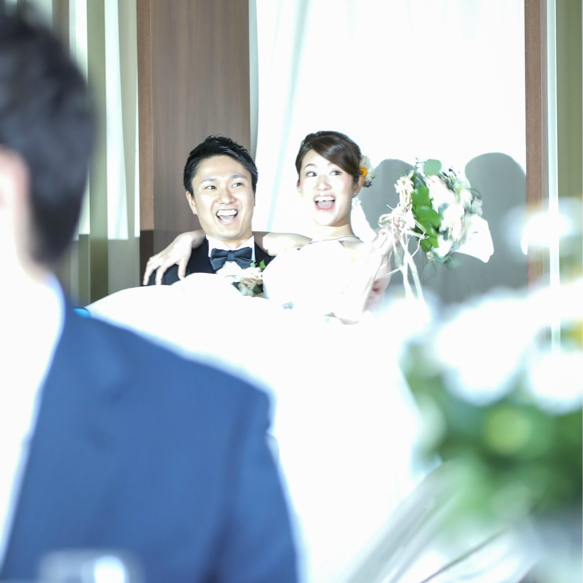 ゲストの方々もすごく盛り上がってくれました。しかし、カーテンの向こうにはダミーのパネルを用意しており司会の方が、「サプラーイズ!皆様後方をご覧ください!」とお姫様抱っこを新郎がしてくれている状態で登場しました。二段階で盛り上がって、とても楽しかったです。