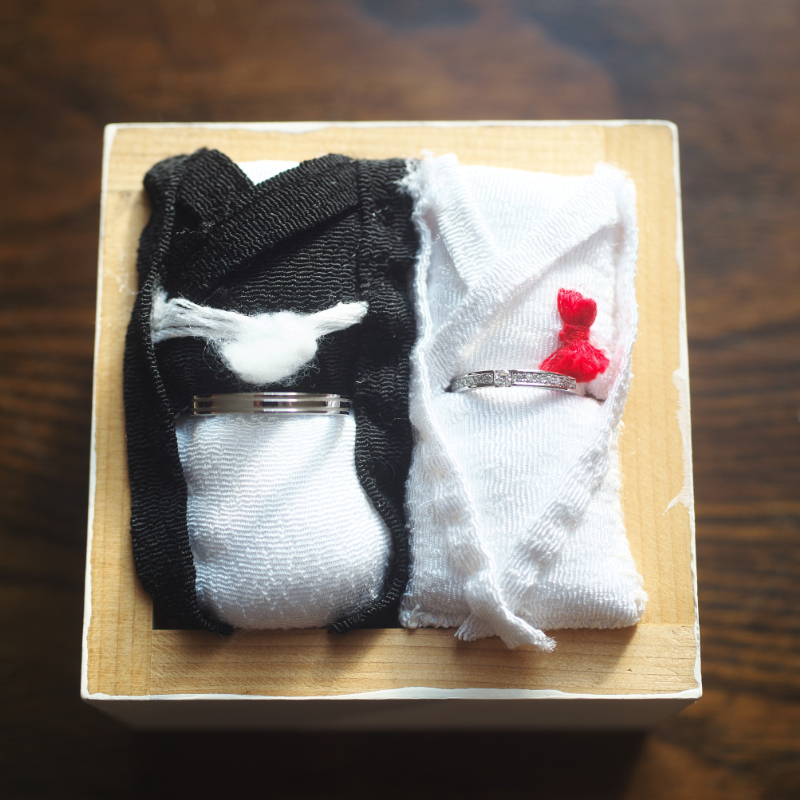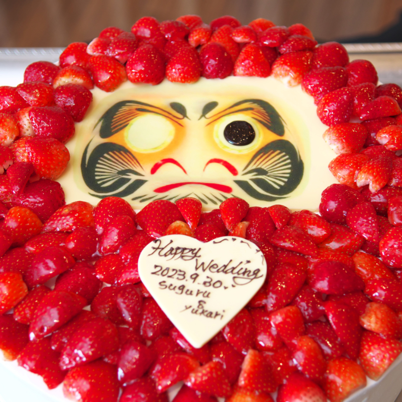 和装での挙式だったので、リングピローは和装の物を手作りし、フラワーシャワーはふたりで折り鶴を折ったところはこだわりました。また和装のままケーキ入刀だったので、デザインをダルマの形にして、ケーキ入刀の代わりにダルマの目玉入れをしました。