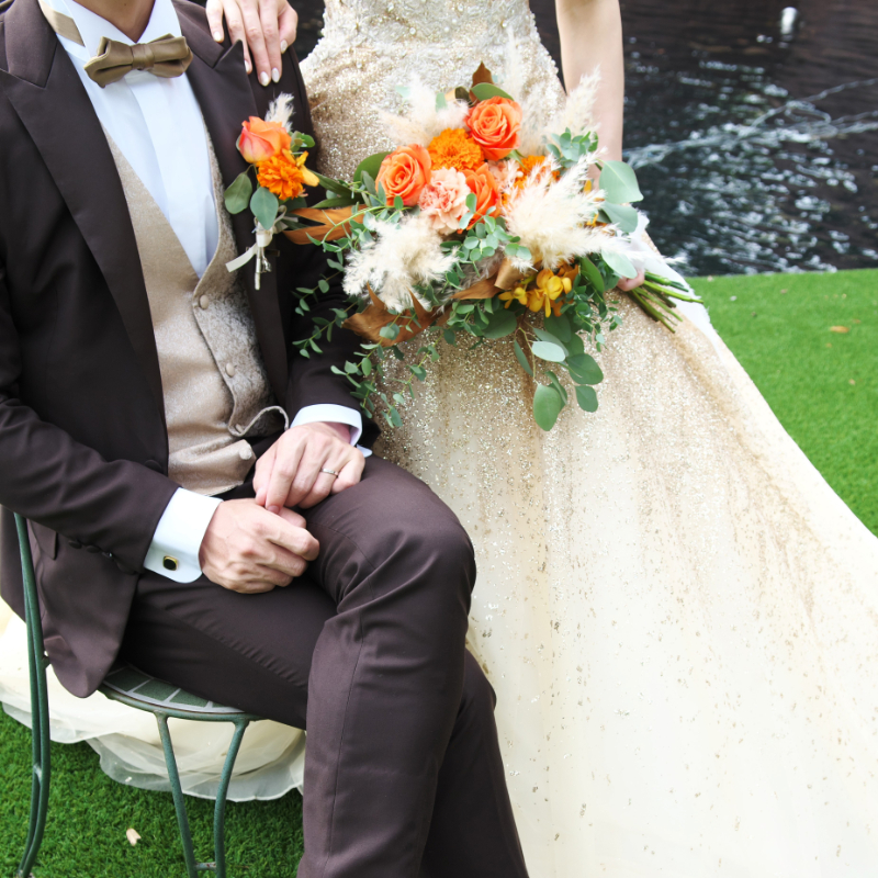 また、最後に渡すプチギフトもお店の方と何度も連絡をとり、自分たちの着るカラードレスやタキシードに似たデザインを作っていただきました。