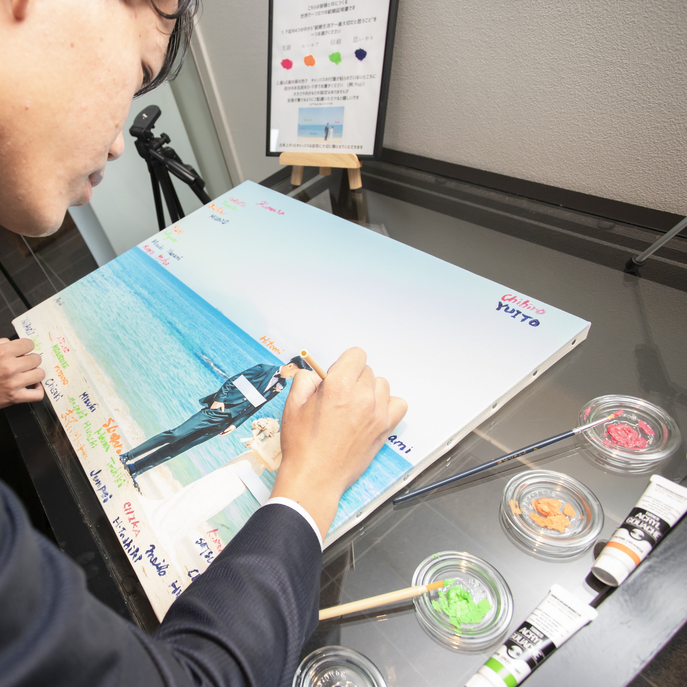 ・ウェルカムスペースに準備したウェディングキャンバスでは、ゲスト参加型の結婚証明書を作り上げることができました。どんな風に仕上がってるか楽しみでしたが、披露宴時に私達も付け足す際、良い感じに完成できて思い出に残るものができました。