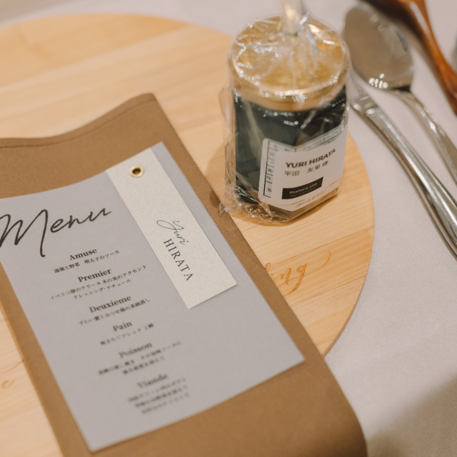 新婦家が手作り販売しているブルーベリージャムをどこかで使用したく、お名前が入ったラベルを貼ることで、ジャムを席札にしました!