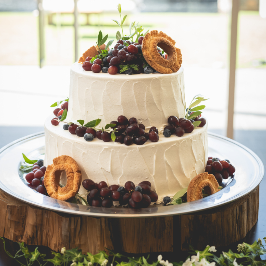 葡萄を使いたい・ドーナツをのせたい!(焼きドーナツ系ではなく揚げドーナツ系がいい!!!)などの細かい希望がありましたが、イメージ通りの素敵なケーキが登場して嬉しかったです。