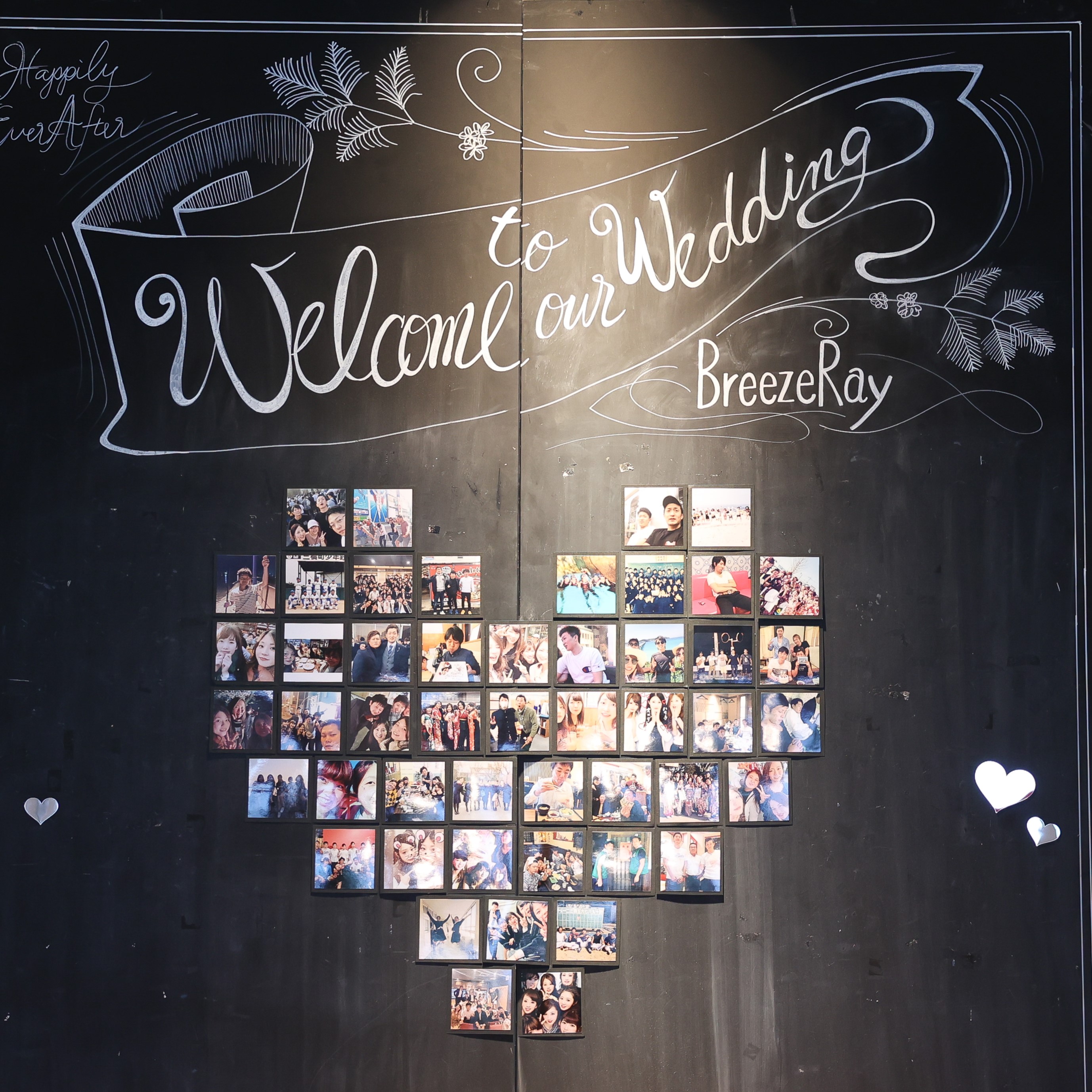 一つ目のこだわりはウェルカムスペースの壁にゲストの方との思い出の写真をハート型に貼りました。(重松さんが良い感じに可愛く貼ってくれました!)ウェルカムスペースは自分達の写真写真になりすぎるのが嫌で懐かしい写真を沢山貼りました♪