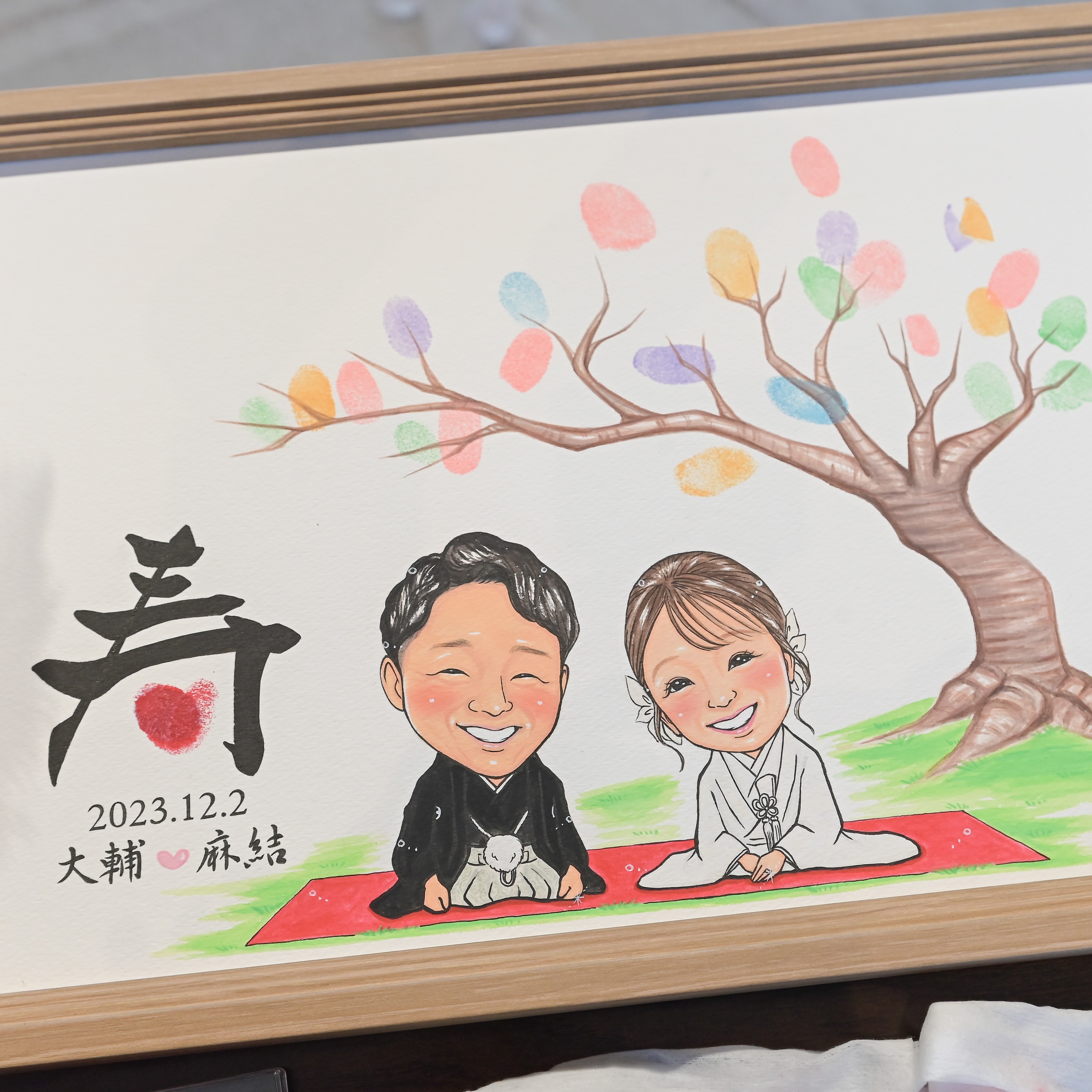 写真で似顔絵を書いていただきましたが、2人にそっくりで、ゲストの方にもウエディングツリーを協力していただき、結婚式が終わった今もお家に飾っています。