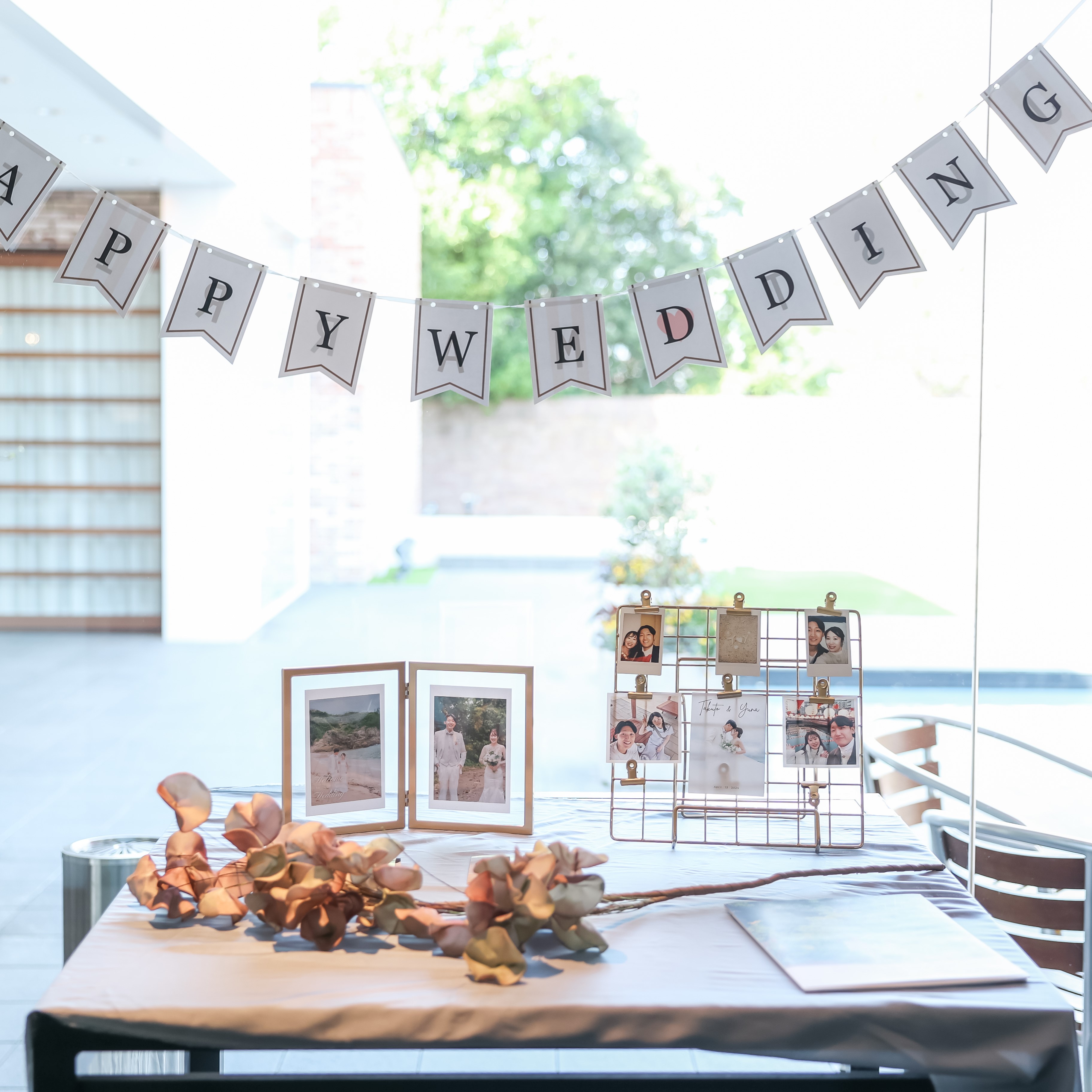 アイテムは席次表、席札、プロフィールブックは自分たちで作成し、席札の裏にはゲストとの写真とメッセージを貼り付け、一人一人に喜んでもらえるように心を込めました。