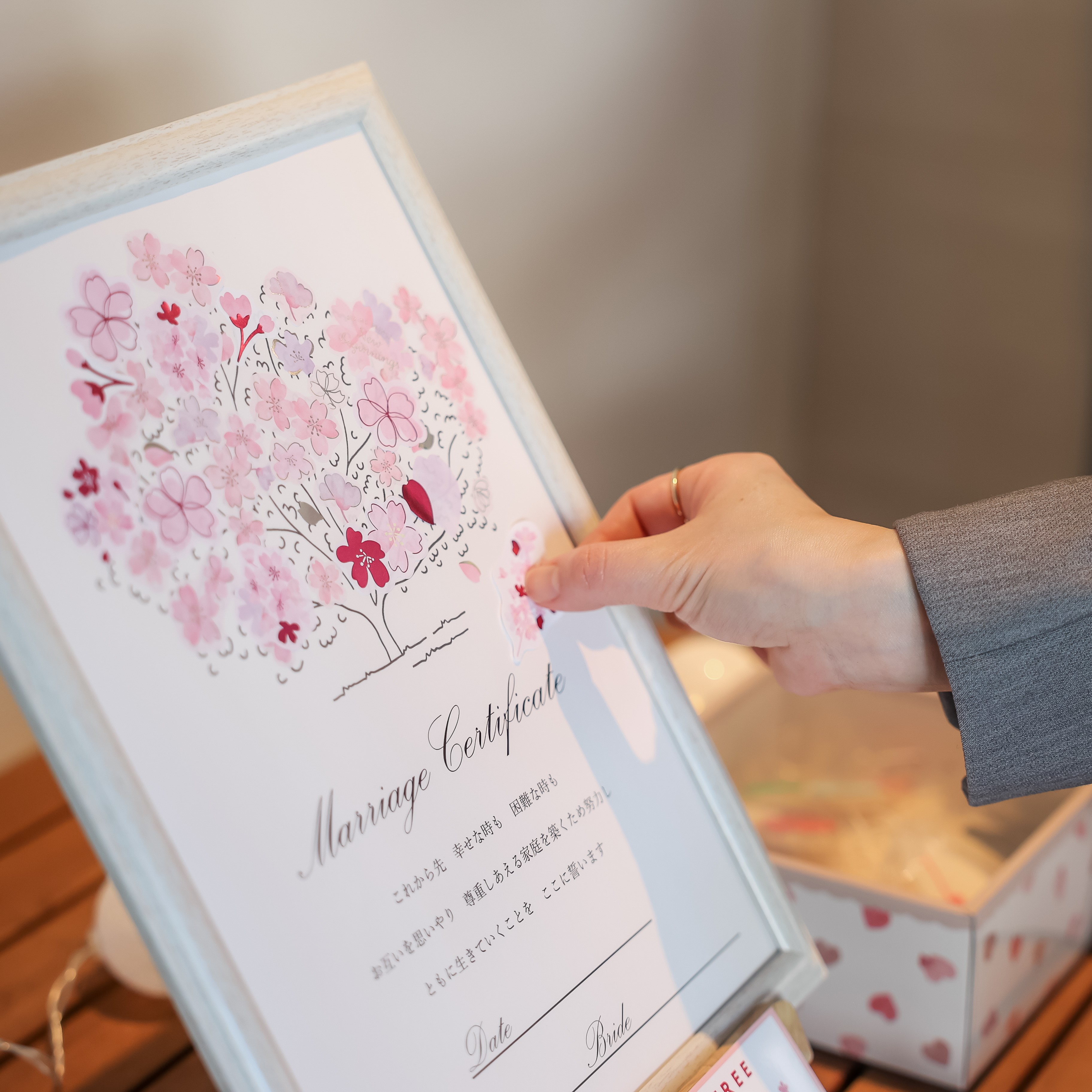 結婚証明書は、ゲストの皆様の手が加わった物を作成したかったので、ゲストの皆様で木を桜の花で満開にしていただくように説明をつけ、桜の花満開で結婚証明書を作成することができたと思います。