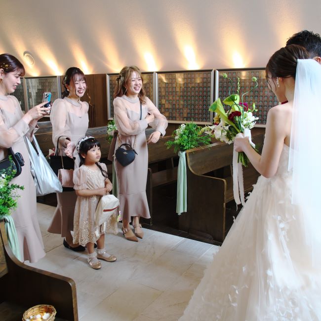 当日は「ゲストみんなが無事に会場に到着するかな」「天気は大丈夫かな」など不安と緊張でいっぱいでしたがプロデューサーさんが「バス出発してますよ」「晴れてきてますよ」など声かけしてもらえたおかげで緊張なども和らいでいきました。挙式がスタートし、ゲストのみんなの顔を見て安心したのを覚えています。