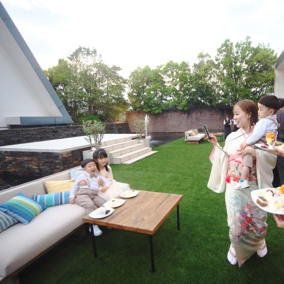 ブリーズレイ・プライベートテラスは素敵なガーデンがあるので絶対ガーデンでケーキ入力とデザートブッフェをしたいなと思っていました。お天気には左右されますが当日はケーキ入力と同時に晴れ間が差し本当に最高な時間を過ごせました。