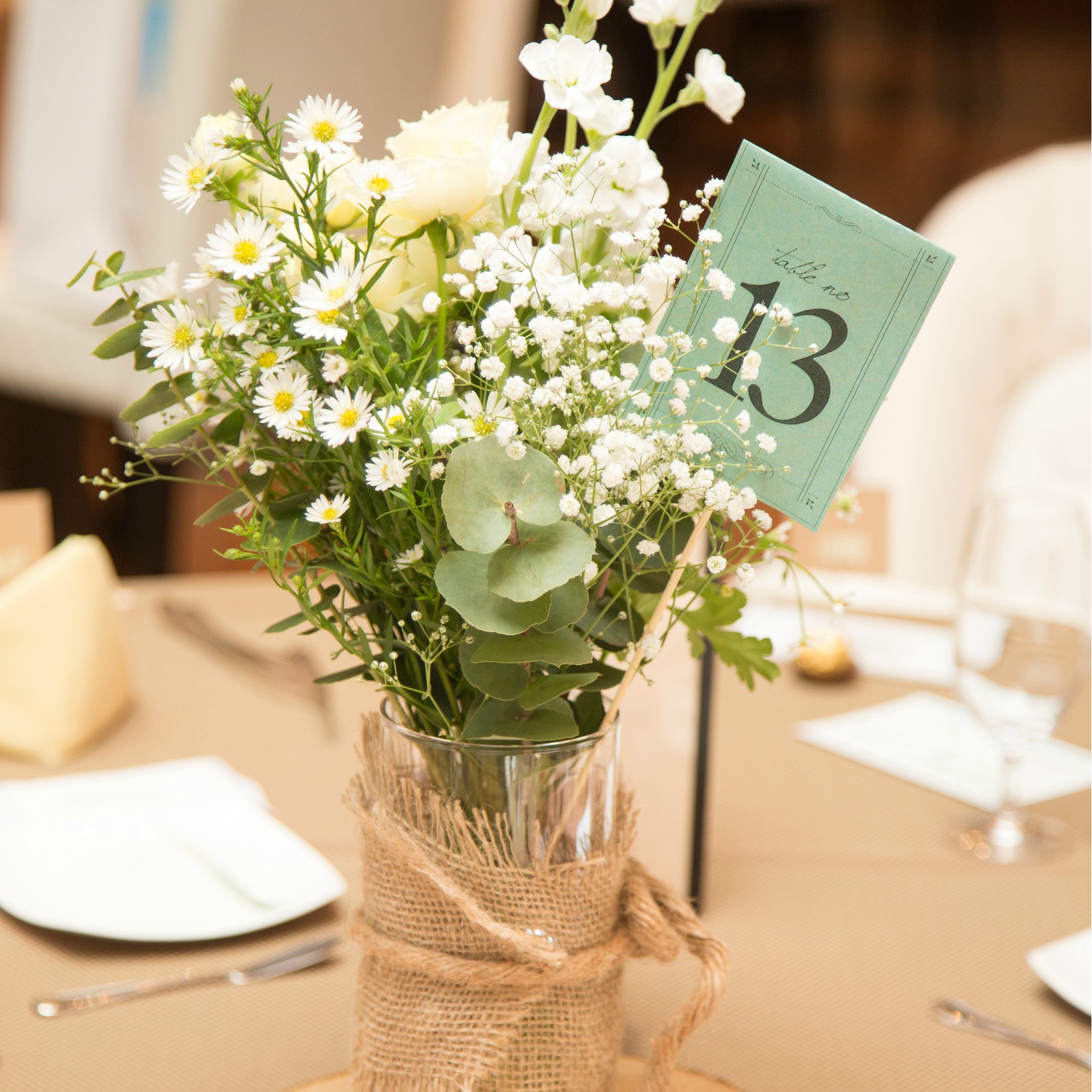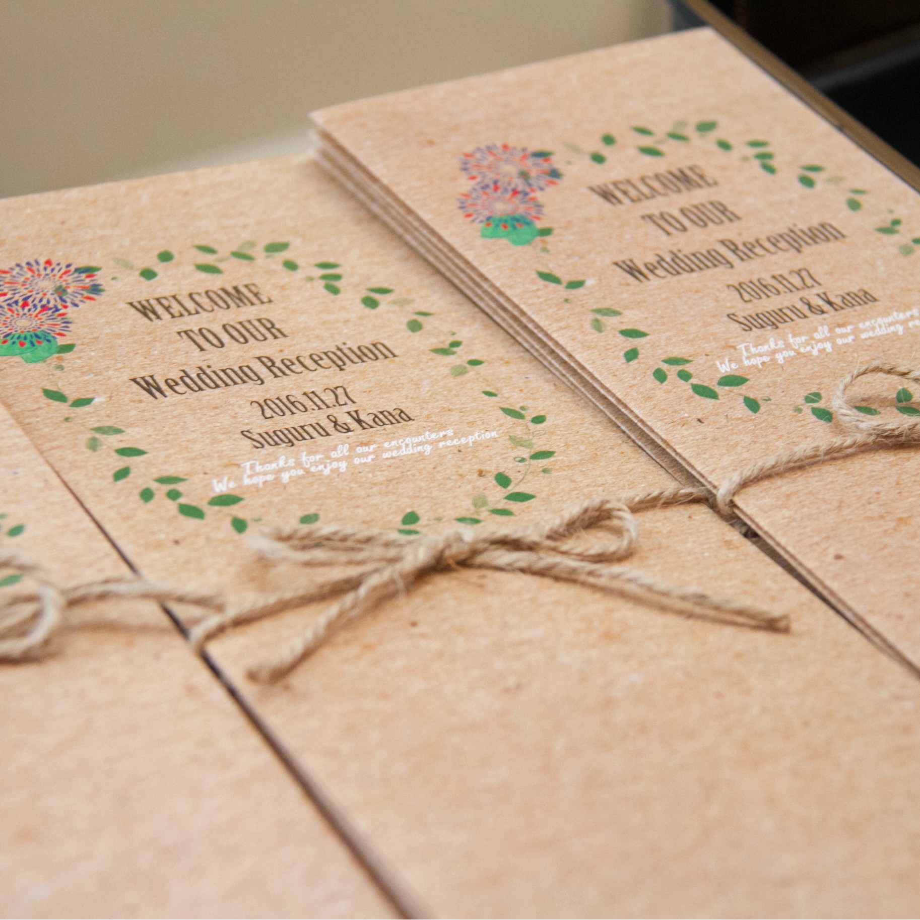 会場の装飾、ブーケにはグリーンを多めにボリュームを出してもらいポイントでカラーをいれました。ペーパーアイテムも会場全体のイメージに合うように紙の質感や麻紐を使ったりとこだわりました。