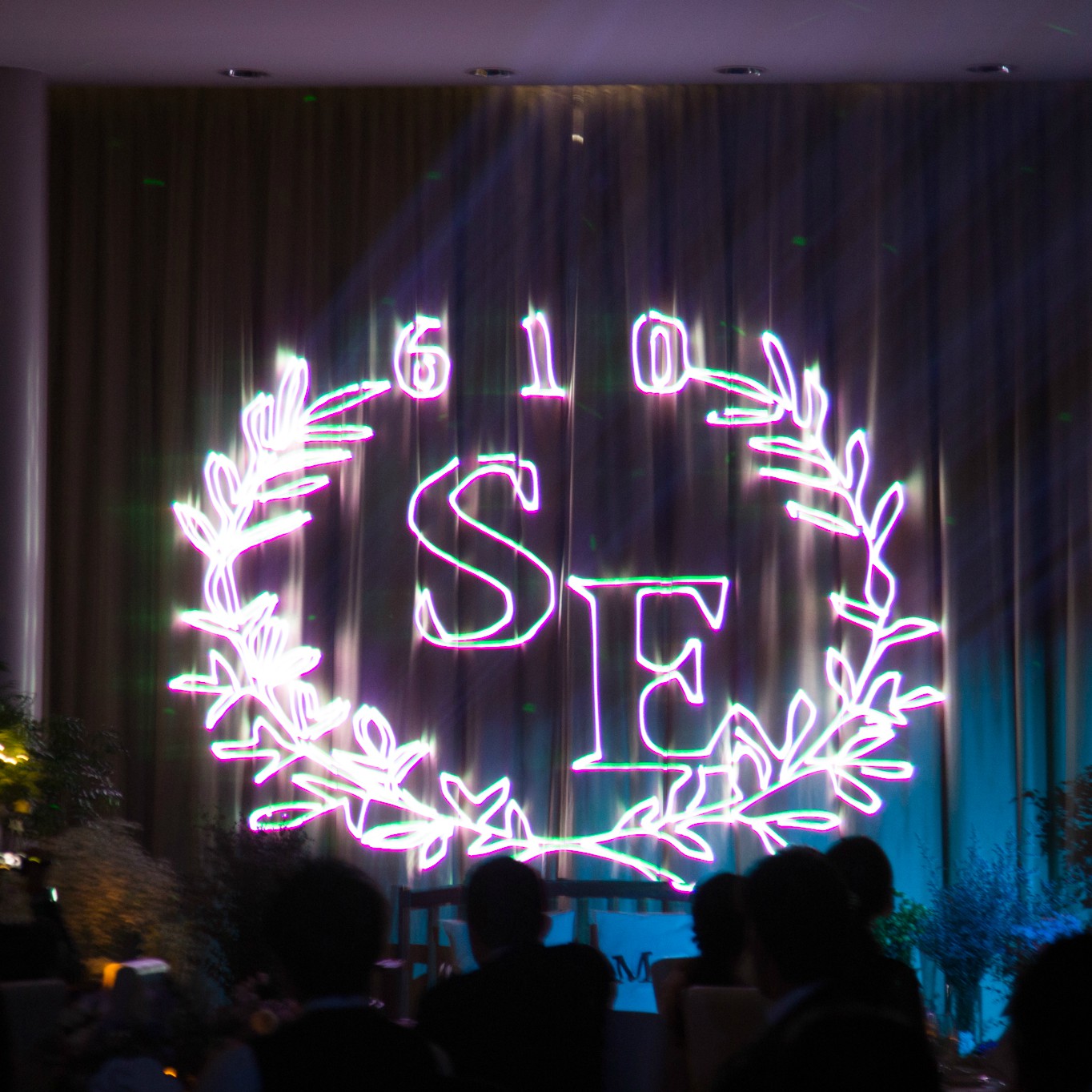 それ以外にもオリジナル空間作りの為に、手作りの小物や装飾を会場の色々な所に取り入れました。ブリーズレイは元々の装飾がお洒落なので、そこに手作りの物を少し加えるだけで映えて、作った物をよりお洒落にみせてくれます!レーザー演出にも私達オリジナルのロゴを入れることができ、オリジナル感を出すことができました。