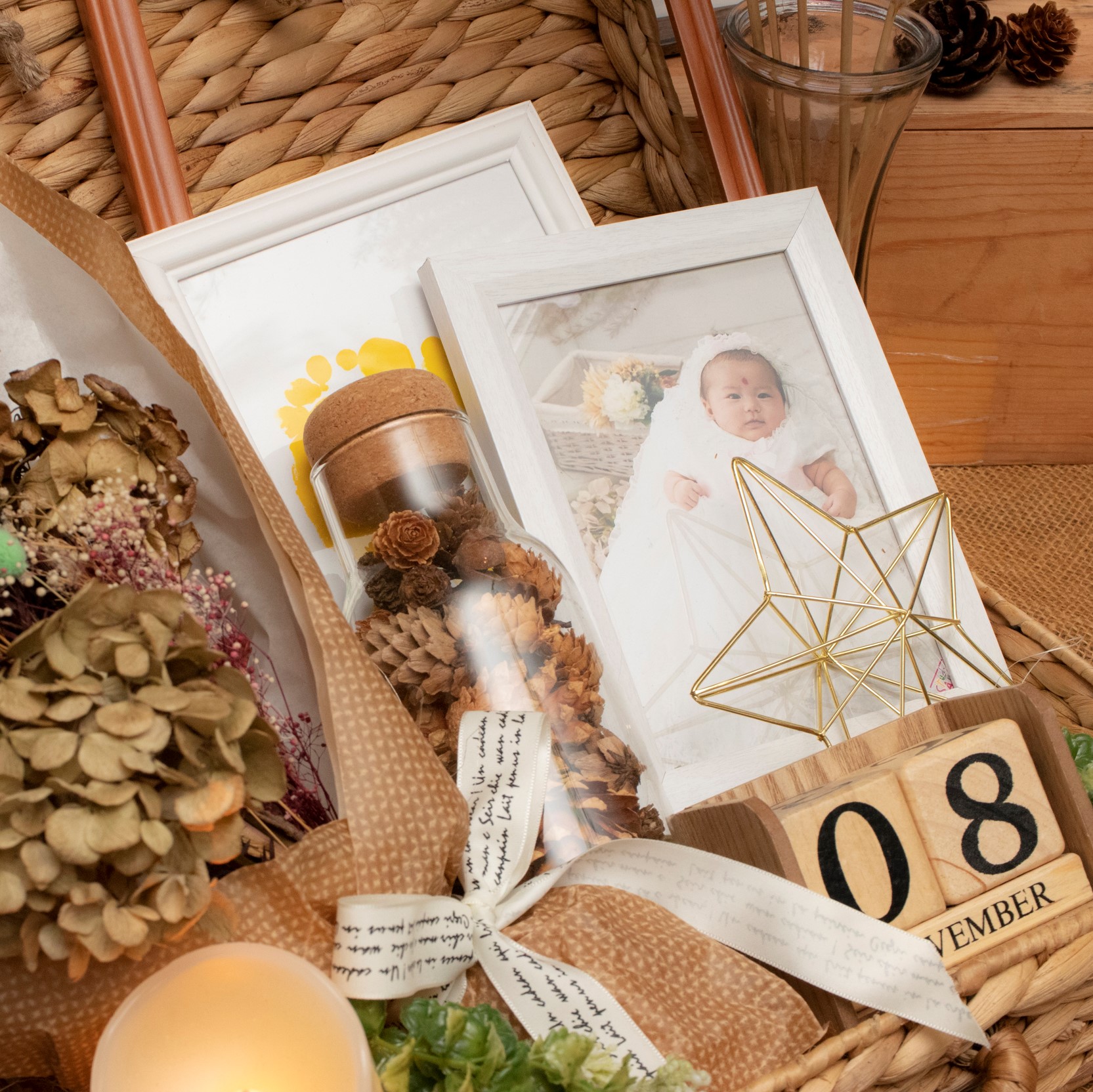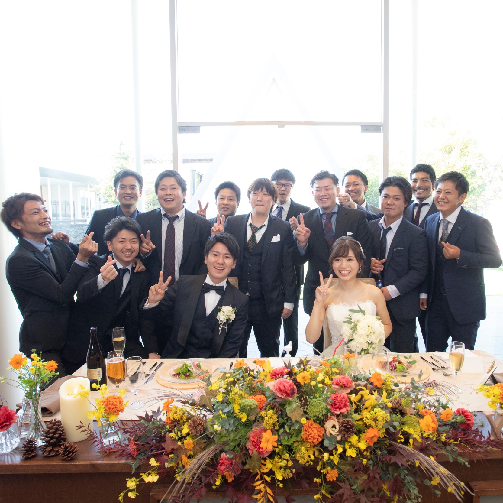 コロナ禍で小規模人数での開催ということもあり、アットホームな雰囲気を意識して準備を進めました。その中でもこだわったポイントと致しましては、季節感とウェルカムスペースです。当初は5月の予定で初夏をイメージしておりましたが11月に延期した為、秋をイメージした会場作りを行いました。ウェルカムスペースに関しましては2人の考えとしてお祝いに来てくれたゲストの方々を一番にもてなす場所、挙式・披露宴が始まるまでお待ちいただく場所ということもあり特にお金と時間を費やしました。装飾は秋をイメージしたカラーでシックに落ち着いた雰囲気の空間を目指し、ゲストの人が退屈しないように赤ちゃん当てゲームや写真撮影のアイテム等を置くなどの工夫を致しました。ゲストの方々が見たときに少しでも懐かしく楽しい気持ちになってもらう為に2人の思い出の写真もたくさん飾りました。披露宴に関しましてもオープニングムービー・プロフィールムービーを兄に協力頂き自作することで、私たちの伝えたいイメージや想いを表現することが出来ました。ゲストの方々に楽しんで頂き少しでも気持ちを返せればと思い、引き出物やプレゼント等に関しましても2人で時間をかけ話し合い決定しました。