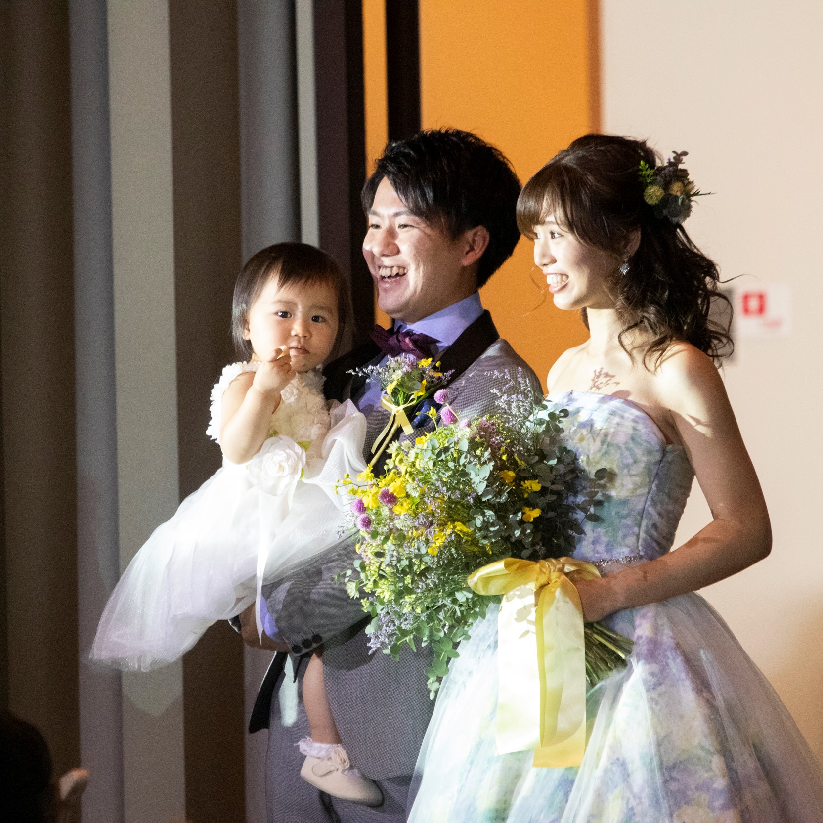 コロナで延期になってしまったことや、2人の意見の食い違いでケンカになってしまったこと、ゲストの方々は楽しんでくれるのだろうかなど多くの不安がありましたが、式が終わり振り返ってみると、とても楽しく充実した時間を過ごすことが出来ました。本当にあっという間の1日で、ゲストの方から「めっちゃいい式だったよ」という声もありとても嬉しく思いました。これも全て当日まで準備をサポートしてくれた浅野さんをはじめスタッフの方々と私たちの家族、コロナ禍でも出席頂いたゲストの皆様のおかげだと感謝でいっぱいです。演出の内容やタイミングも理想通りでした。披露宴会場の雰囲気も私たちがイメージしていたものそのものでとてもよかったです。反省点としては1歳半の娘も様々なタイミングで参加しましたが、くずってしまって上手くいかない部分あったのでもう少し対策等を練っておけばよかったかなと思いました。私たちの式の当日は快晴で天候に恵まれましたが雨天だったらと思うと雰囲気や内容がガラッと変わってしまうと思うので事前打ち合わせにて要準備しておくべきだと感じました。プランナーとはお互いに心配掛けてしまうこともありましたが、「必ず最高の式にしましょう」という言葉を信じて一緒に進めていき無事に終えることが出来ました。本当にありがとうございました。