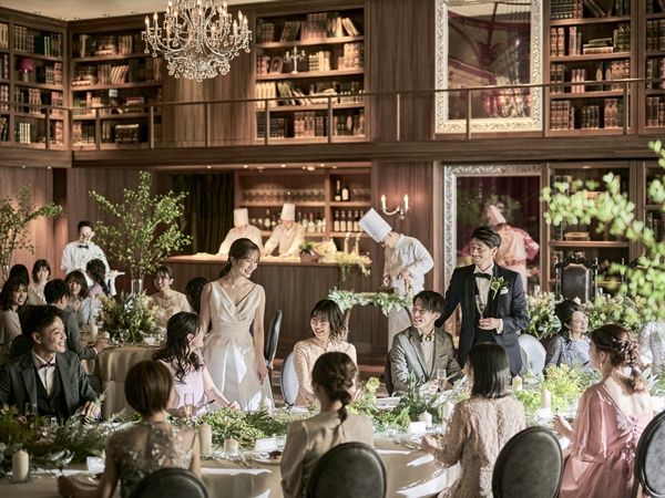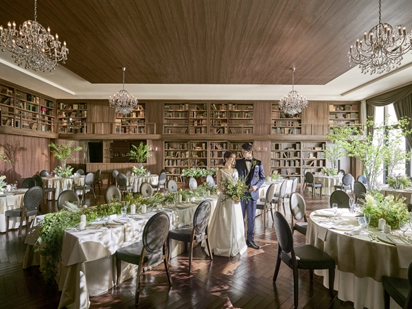 貴族の邸宅にある書斎をイメージしたRUBINOのインテリア。書斎をイメージして揃えられた書棚や、あたたかみのあるウッディな調度品は、まるで映画のワンシーンのような上質で豊かな世界観を演出します。おふたりらしく、思いのままにアレンジしていただける空間です。