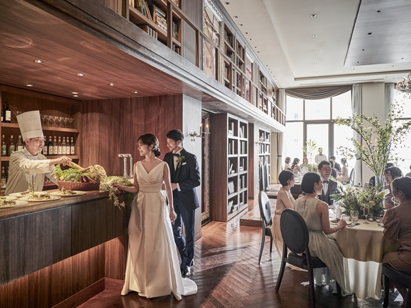 バンケットの隣には専用のキッチンを併設し、おふたり専属の料理人が創るこだわりの美食を、ベストなタイミングでおもてなしいたします。また、ドリンクカウンターでは種類豊富なドリンクはもちろん、おふたりオリジナルのカクテルを振る舞うこともできます。