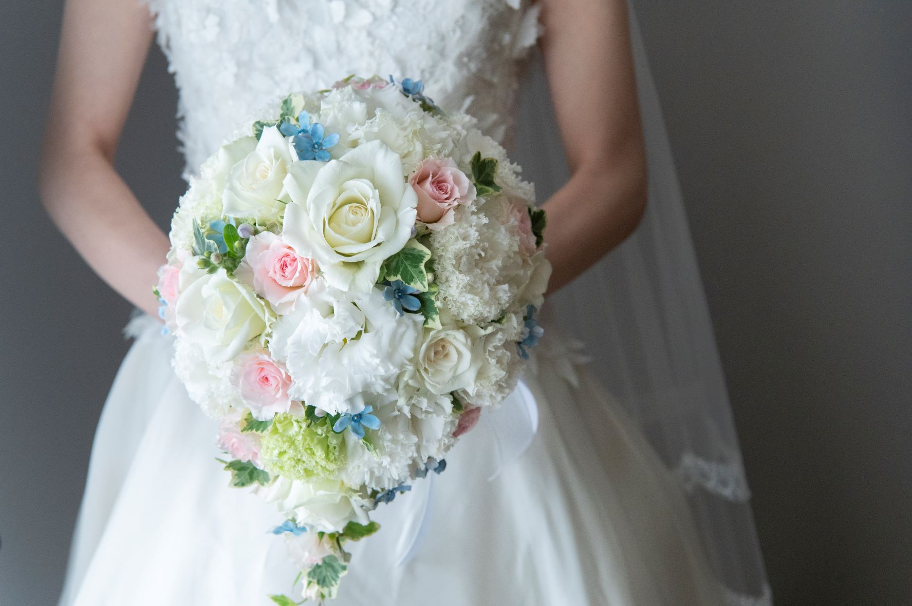 白を基調に、おふたりの好きな色を混ぜ込んだキャスケードブーケです。