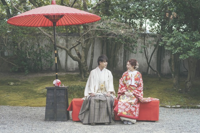 4つ目は赤い和傘×和装の組み合わせが素敵です